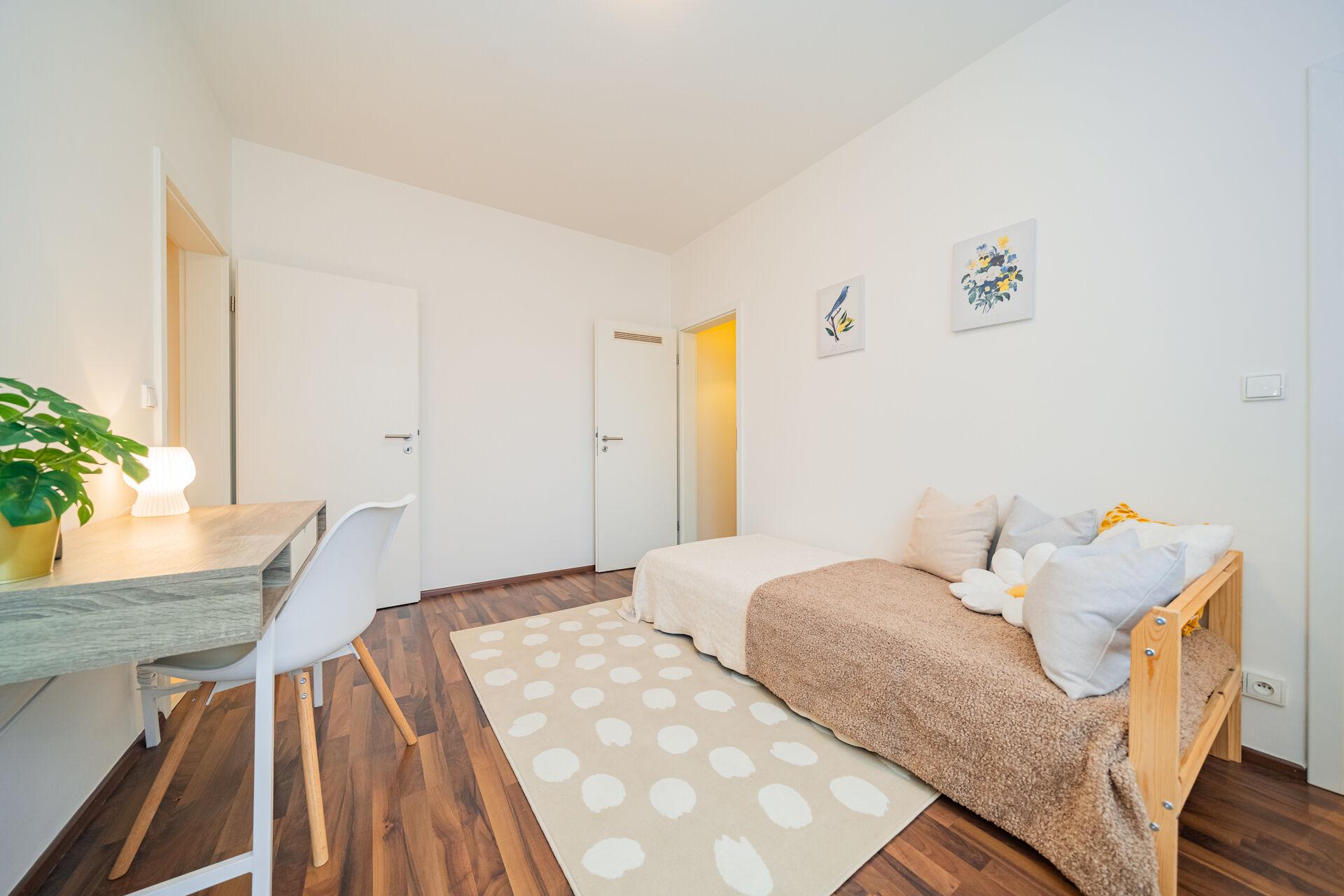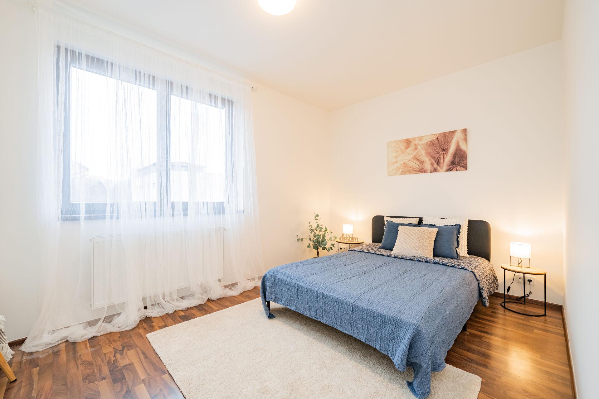 Byt je navržen tak, aby bylo možné jeho praktické a funkční zařízení. Vstupní dveře bytu jsou certifikovány 3. třídou bezpečnosti a je zde příprava pro instalaci elektronického bezpečnostního systému. Podlahová krytina je v pokojích plovoucí podlaha a v chodbě a koupelnách je instalována dlažba. K bytu náleží parkovací místo v přízemí budovy a sklep o rozloze téměř 3 m2, oboje je již zahrnuto v prodejní ceně.