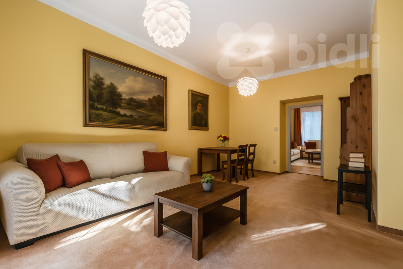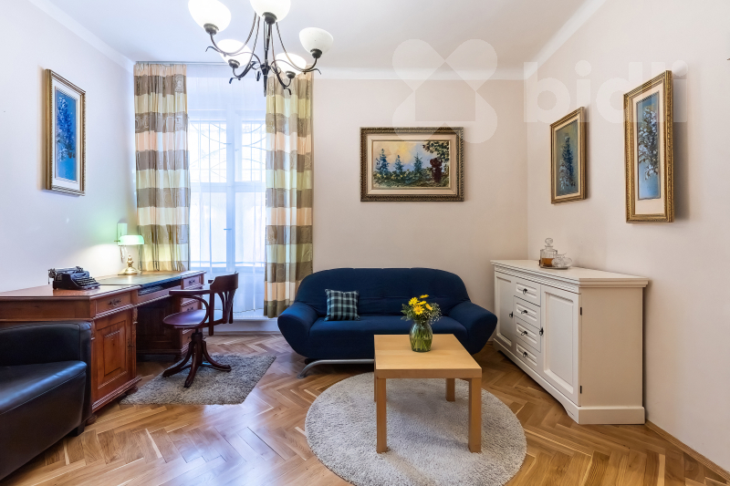Dispozice bytové jednotky sestává z ložnice, obývacího pokoje se vstupem na balkon, samostatného kuchyňského koutu, dalších dvou pokojů, 2x koupelny s vanou a sprchovým koutem, samostatné toalety, prostorné chodby, kuchyňského koutu, nadstandardní spíže, technické místnosti s přípojkou na pračku. Podlahy tvoří původní téměř sto let staré dřevěné parkety, které prošly moderní renovací, doplněné o koberce a dlažbu.
