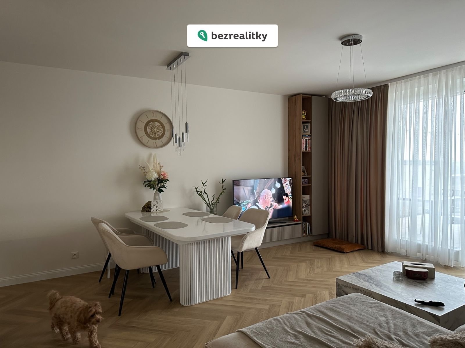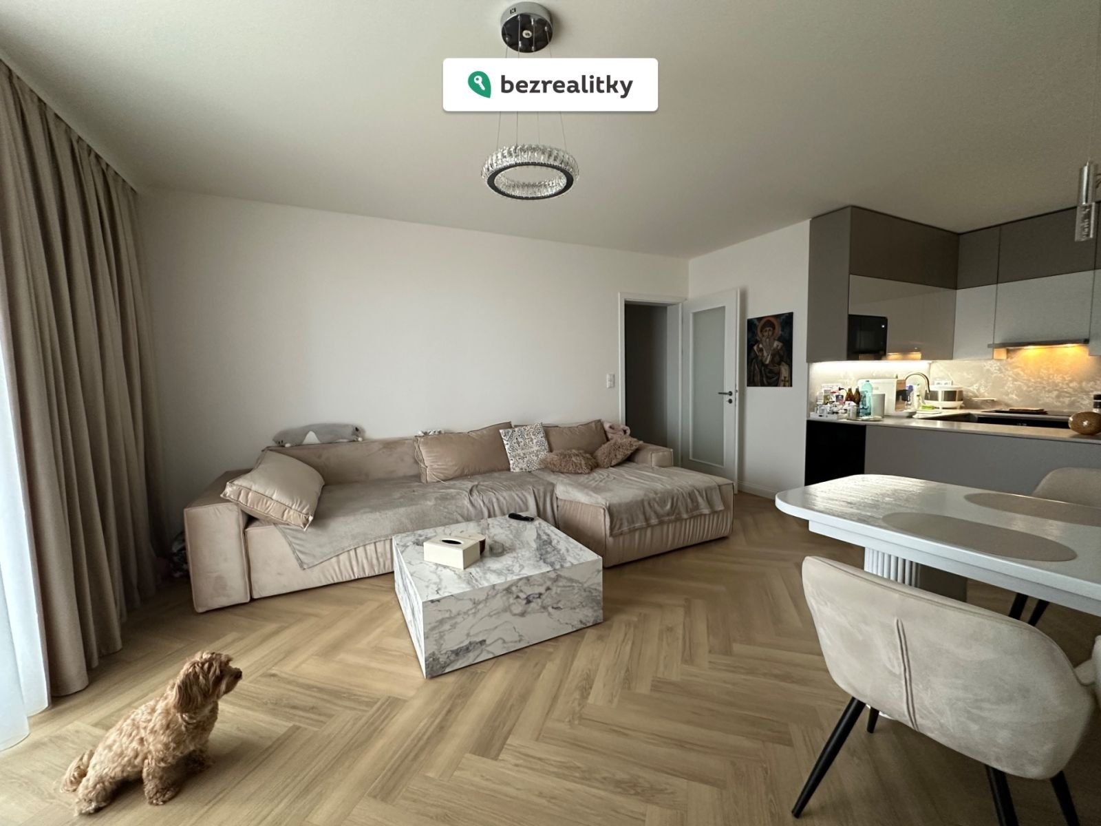 Byt se prodává kompletně vybavený – moderní kuchyňská linka s křemennou pracovní deskou a spotřebiči, vinylové podlahy, vestavěné skříně a kvalitní nábytek. Stačí se jen nastěhovat.