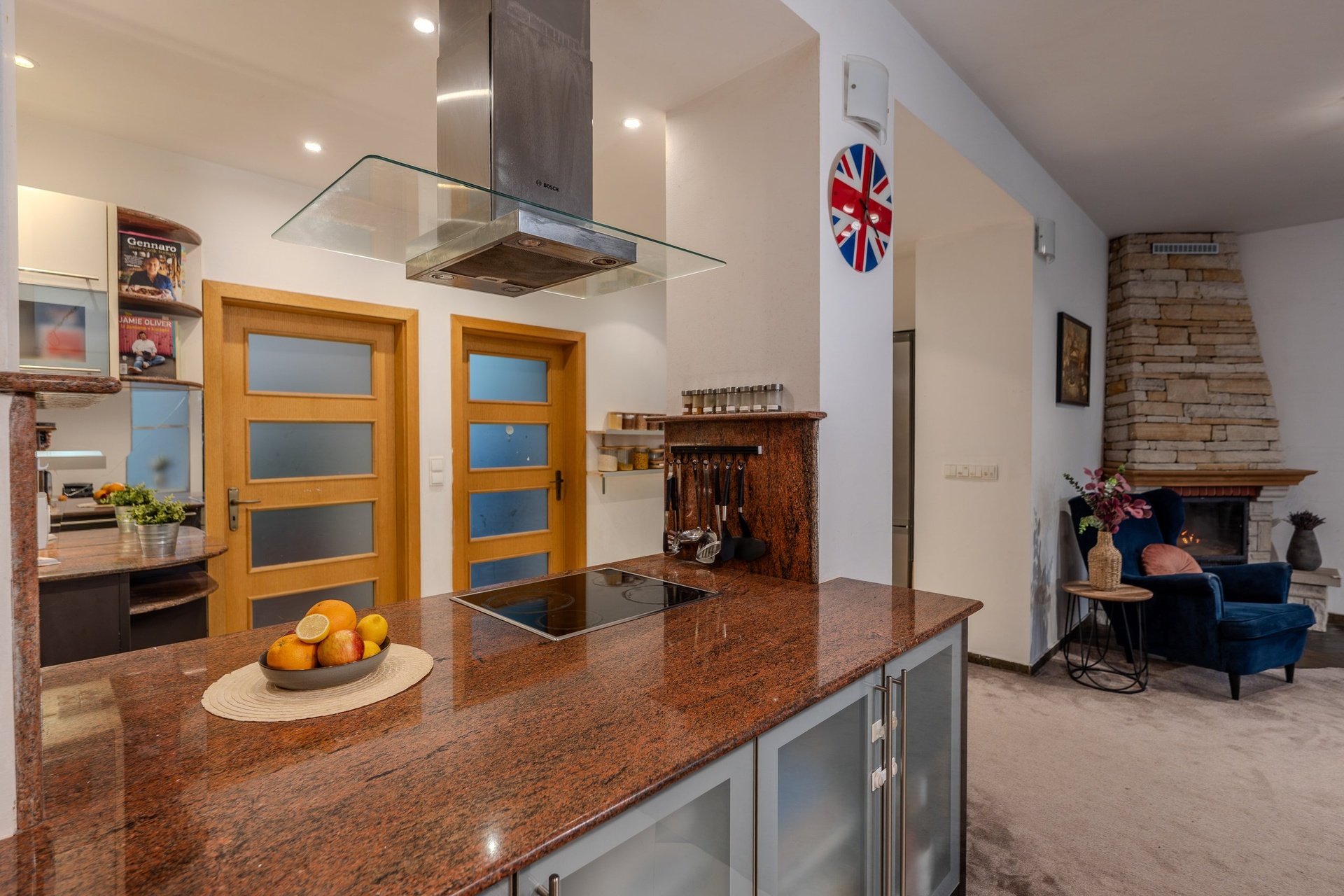 Dominantou bytu je velkorysý obývací pokoj spojený s jídelnou a kuchyňským koutem. Celý prostor je prosvětlen velkoformátovými okny s výhledem na zahradu s terasou, která je přístupná i dveřmi z ložnice. Kuchyně zaujme kamennými deskami a originálním provedením se zrcadly, které prostor opticky zvětšují.