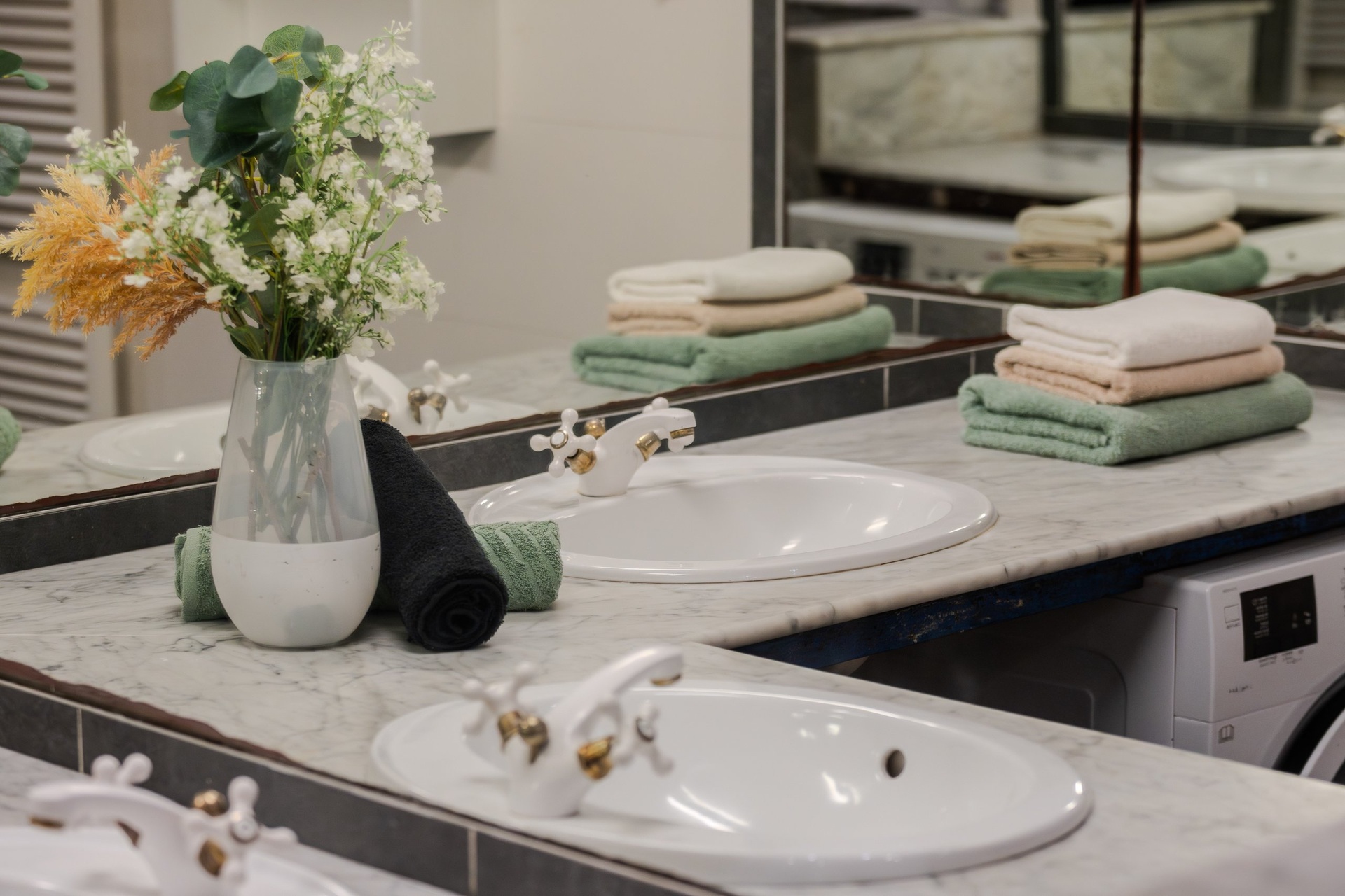 Dominantou bytu je velkorysý obývací pokoj spojený s jídelnou a kuchyňským koutem. Celý prostor je prosvětlen velkoformátovými okny s výhledem na zahradu s terasou, která je přístupná i dveřmi z ložnice. Kuchyně zaujme kamennými deskami a originálním provedením se zrcadly, které prostor opticky zvětšují.