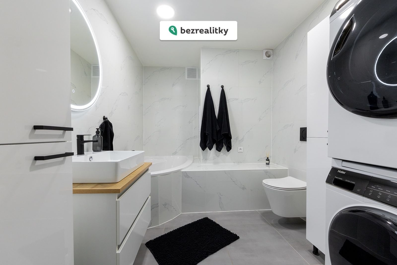 Koupelna je vybavena rohovou vanou, toaletou, pračkou a sušičkou. Byt dále nabízí tři samostatné pokoje, které lze využít jako ložnici, dětský pokoj, pracovnu nebo šatnu, a praktickou chodbu. Součástí bytu je také sklep v suterénu domu.