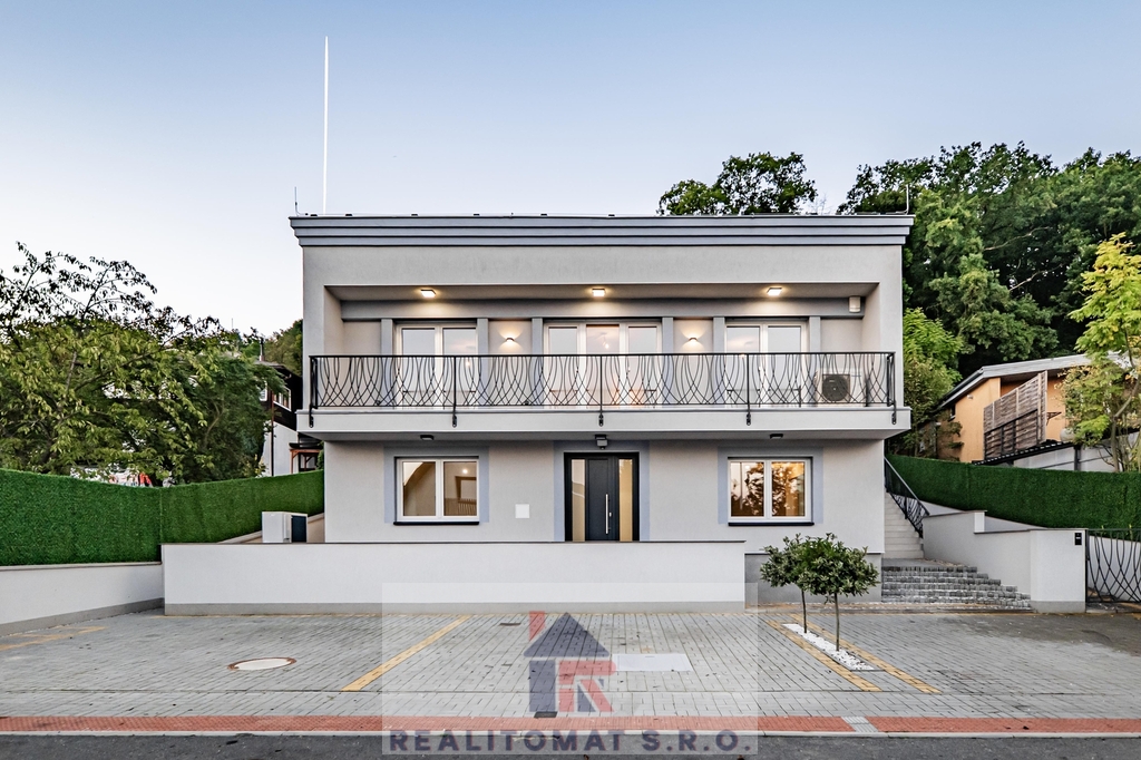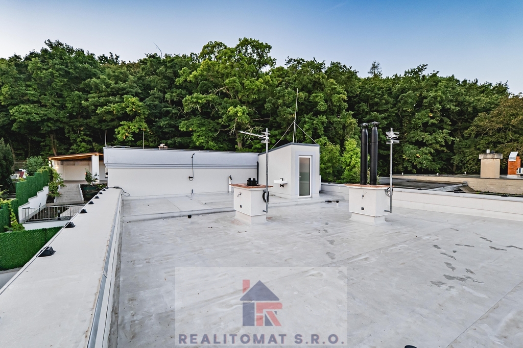 "V této nabídce nabízíme prodej vrchního domu, kde najdete 5 obytných místností + 2x kuchyň o celkové užitné ploše 175 m2. Okolo domu je zahrada o velikosti 329 m2, kde najdete terasu, která je přímo přístupná z obývacího pokoje, zastřešenou pergolu - zimní zahradu s přípravou na kuchyňskou linku. Dále se po schodech dostanete na střešní terasu o velikosti cca 130 m2, kde je příprava na vířivku a saunu. Z terasy je výjimečný výhled na Prahu a za zády máte les - přírodní rezervaci. K domu náleží parkovací stání za elektrickou branou u domu s privátním výjezdem a dole po schodech v ulici Pod Lesem najdete 2x parkovací stání s přípravou na nabíječku na elektromobily."