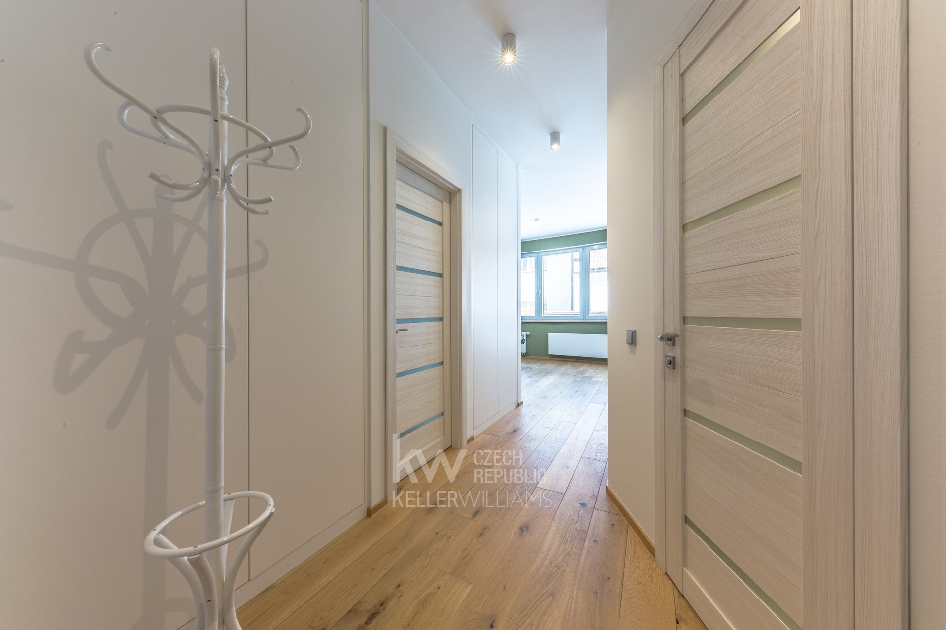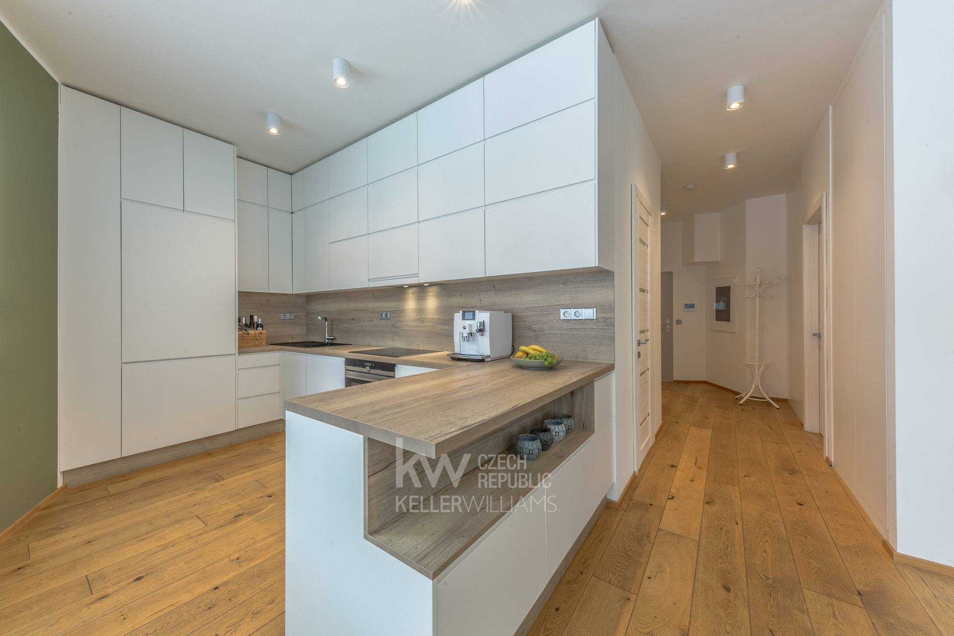 Byt je částečně zařízen – nová kuchyňská linka je vybavena vestavnými spotřebiči Siemens, v předsíni jsou decentní vestavné skříně navržené tak, aby nenarušovaly čistý design interiéru. V koupelně je prostor pro pračku i sušičku.