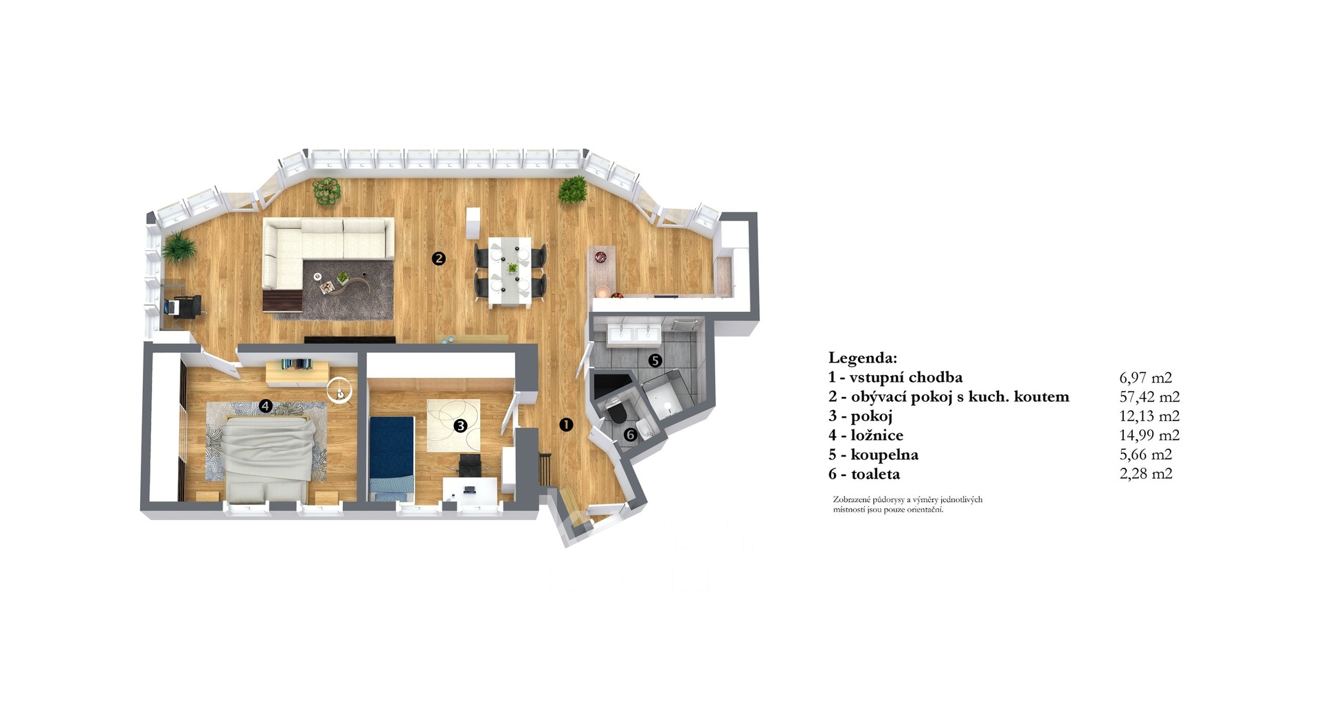 Dominantou bytu je prostorný a prosluněný obývací pokoj s kuchyňským koutem o výměře 48 m², kterému dodává charakter zaoblená stěna s velkoformátovými okny téměř po celé délce. Součástí bytu jsou dále dvě ložnice (12 m² a 15 m²), elegantní koupelna s proskleným sprchovým koutem a stropní sprchou, a samostatná toaleta.