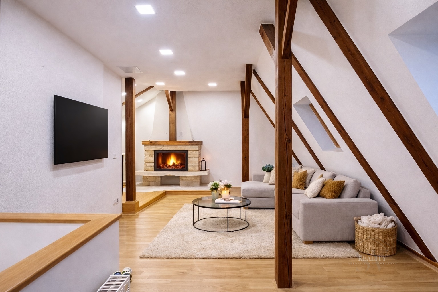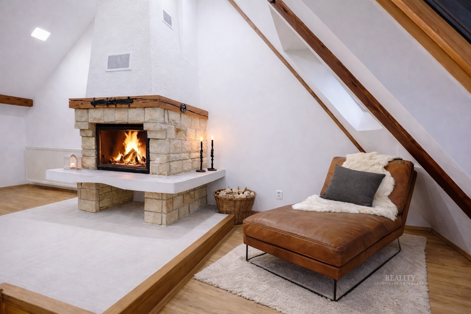 Velkorysý podkrovní obývací prostor s krbem, kuchyňským koutem, přiznanými historickými trámy a přímým vstupem na terasu. Krb zde tvoří výraznou dominantu interiéru a zároveň plní funkci doplňkového zdroje tepla.