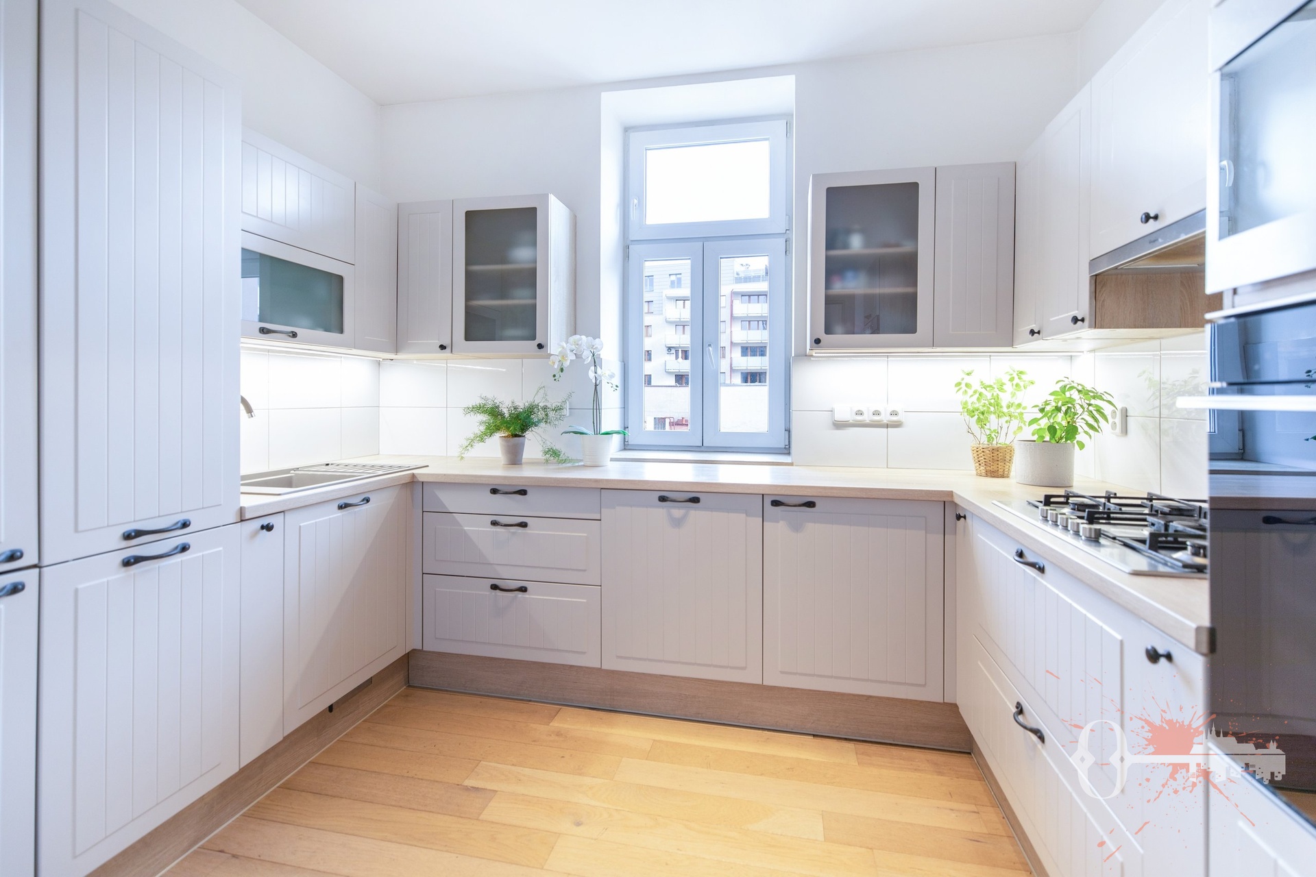 Interiér působí svěže a útulně díky dřevěným podlahám z běleného dubu, které dodávají prostoru lehkost a nadčasovost. Kuchyně pochází od výrobce, pro kterého je kuchyně skutečným srdcem každého domova, a je navržena tak, aby přinášela radost z vaření i společných chvil. Vestavěné skříně na míru nabízejí úložné prostory, které dokonale respektují dispozici bytu a budí příjemný pocit pořádku a elegance. Koupelna je vybavena kvalitní sanitou od uznávaného německého výrobce a v bytě nechybí ani moderní radiátory s termostaty, díky nimž lze snadno navodit příjemné klima.