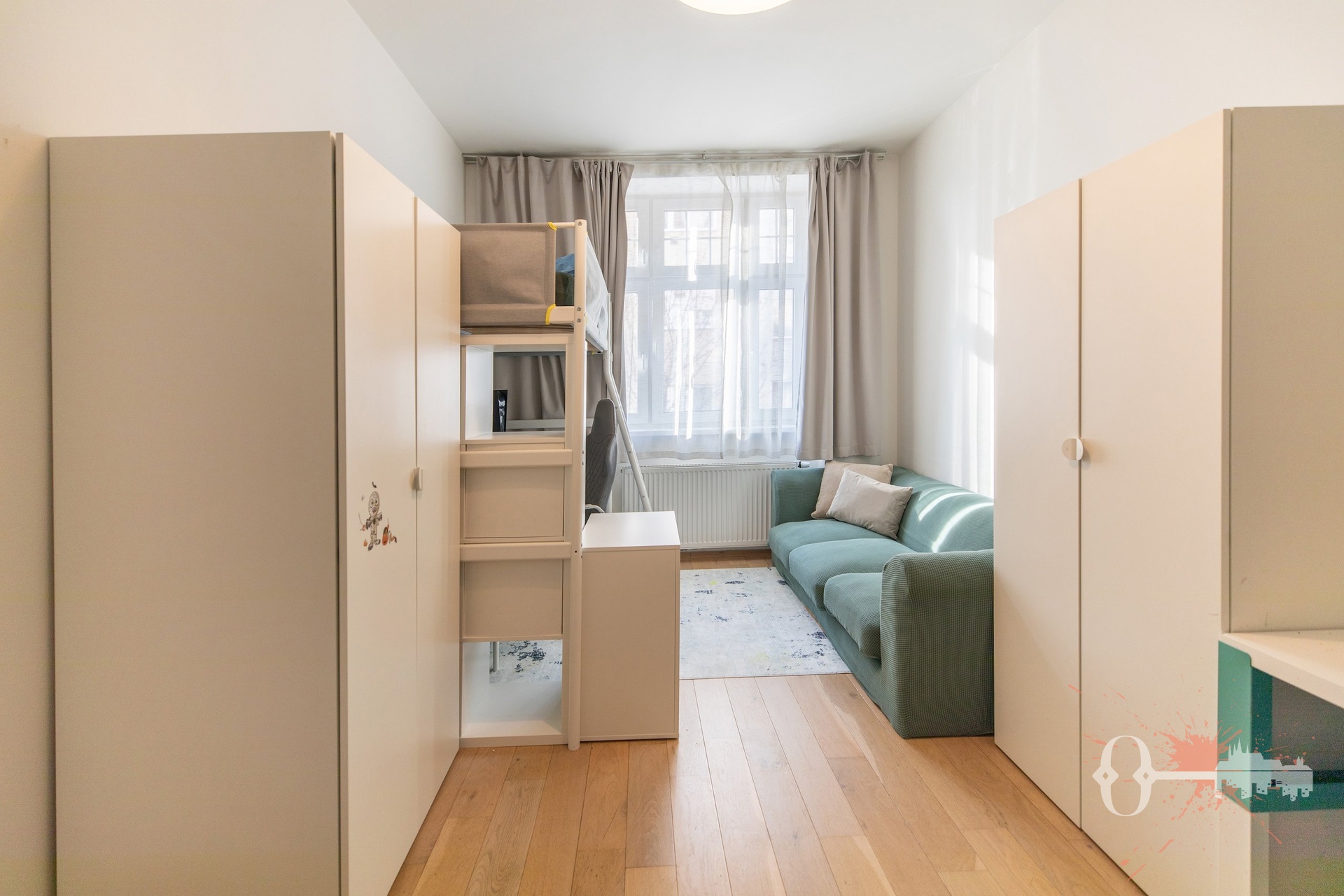Interiér působí svěže a útulně díky dřevěným podlahám z běleného dubu, které dodávají prostoru lehkost a nadčasovost. Kuchyně pochází od výrobce, pro kterého je kuchyně skutečným srdcem každého domova, a je navržena tak, aby přinášela radost z vaření i společných chvil. Vestavěné skříně na míru nabízejí úložné prostory, které dokonale respektují dispozici bytu a budí příjemný pocit pořádku a elegance. Koupelna je vybavena kvalitní sanitou od uznávaného německého výrobce a v bytě nechybí ani moderní radiátory s termostaty, díky nimž lze snadno navodit příjemné klima.