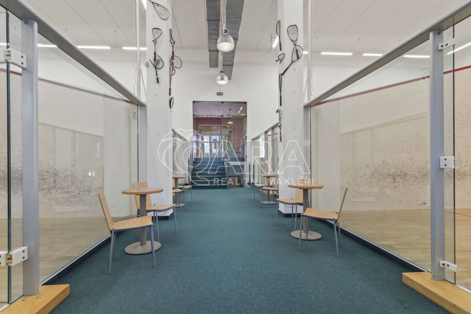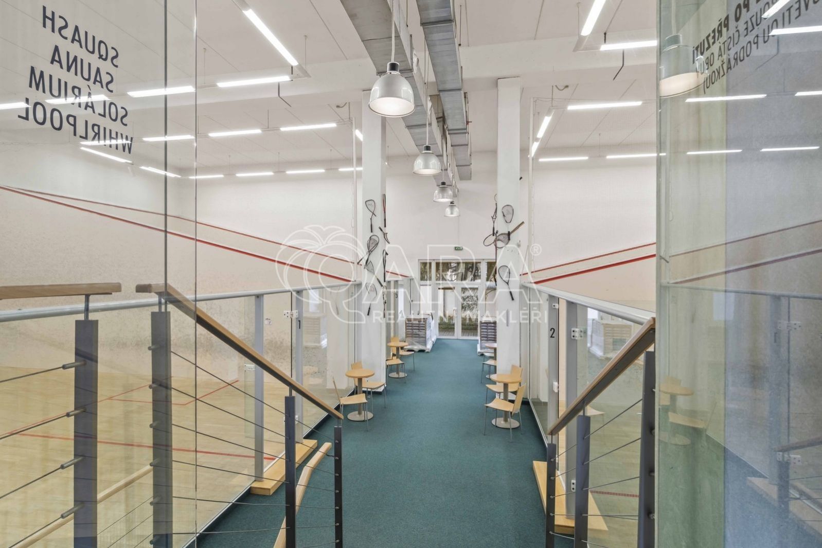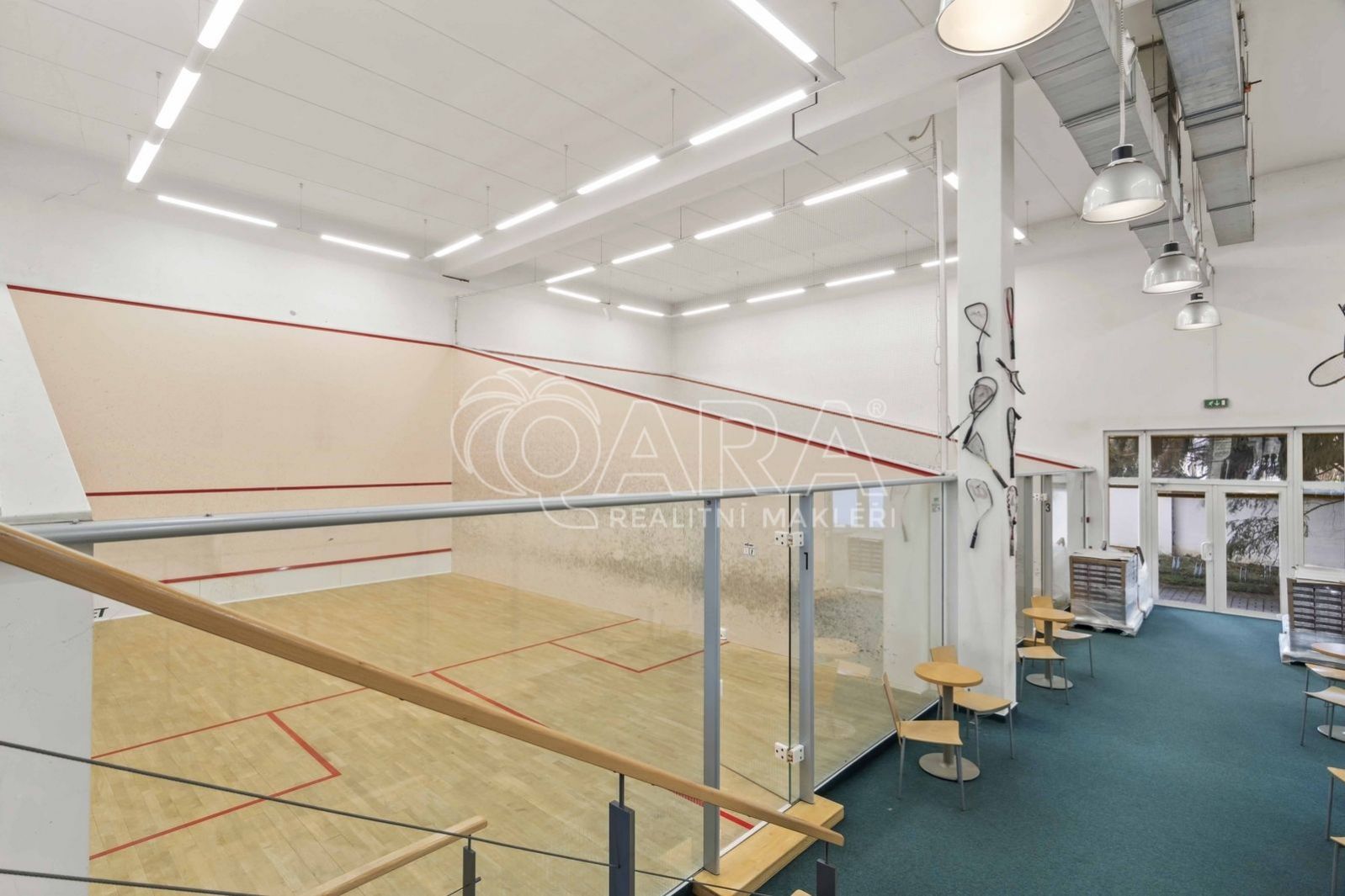 Přízemí (1. NP 541m2: Sportovní srdce objektu 4 squashové kurty s výškou přes dvě podlaží.Prostory pro posilovnu.Reprezentativní recepce se zázemím a barem.Šatny a sprchy pro sportovce.