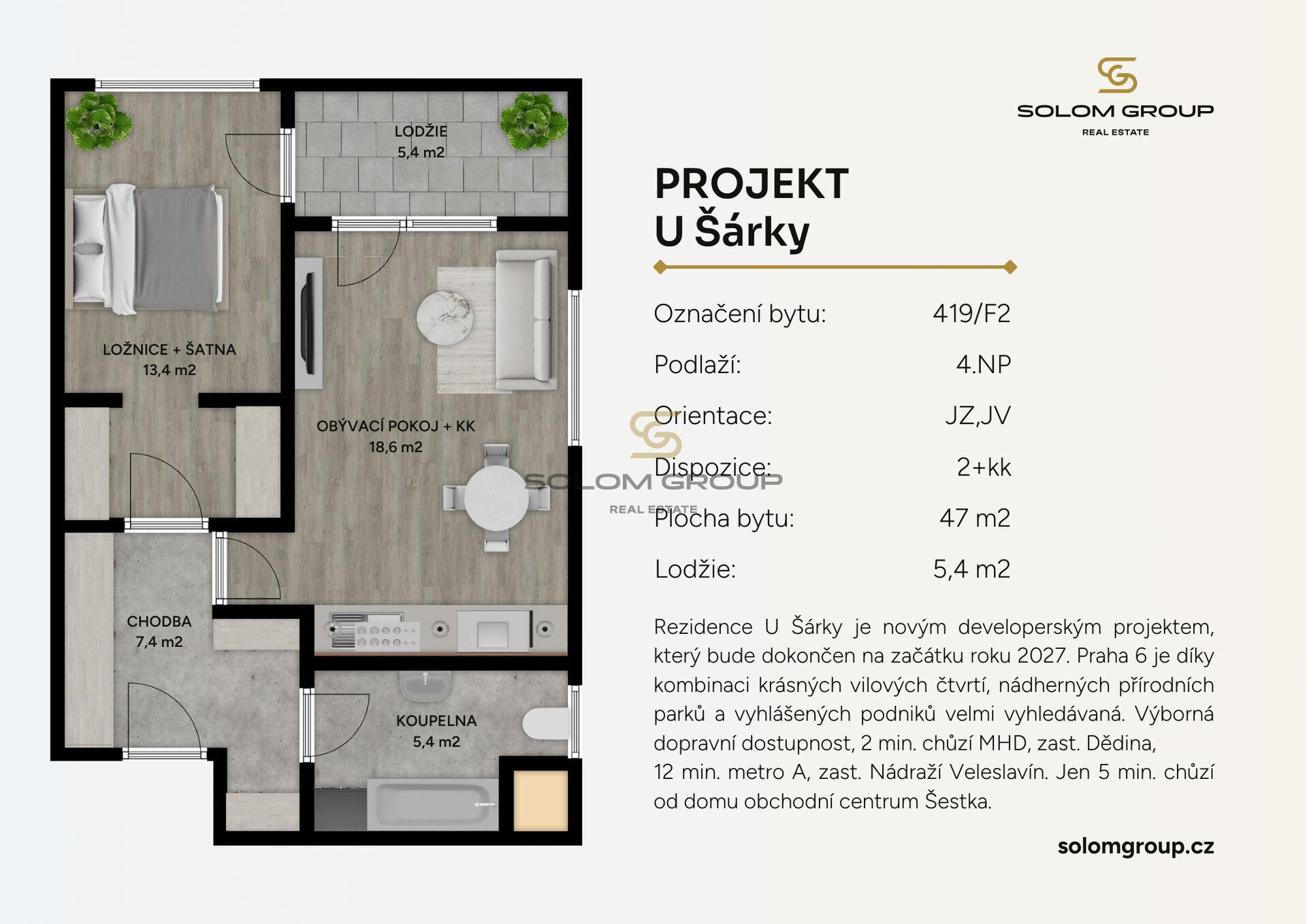Prodej nového bytu 2+kk o velikosti 47 m² + lodžie 5,4 m², který se nachází ve 4. NP cihlové novostavby v rezidenci U Šárky, Praha 6 – Ruzyně (Dům F2).