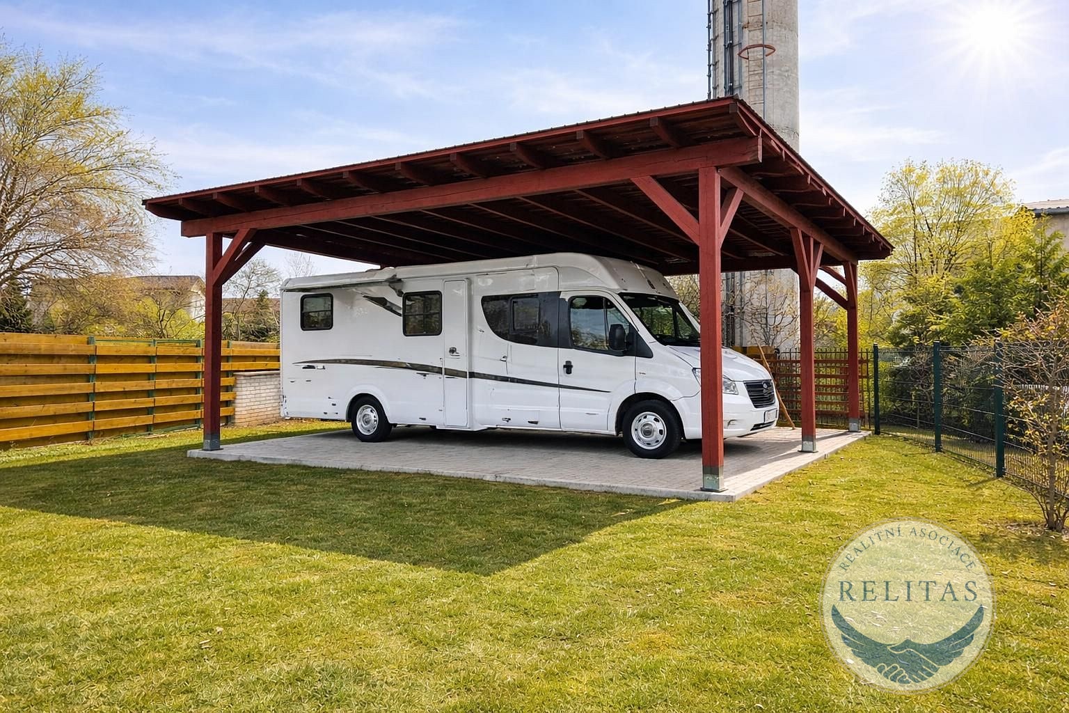 Na zahradě stojí nadstandardně vysoký přístřešek, který je svou plochou i výškou přizpůsoben pro parkování karavanu nebo obytného vozu. Možno využít i jako stylovou pergolu pro posezení s přáteli. Na zahradě roste množství ovocných stromů – sklízejte třešně, jablka, meruňky a švestky.