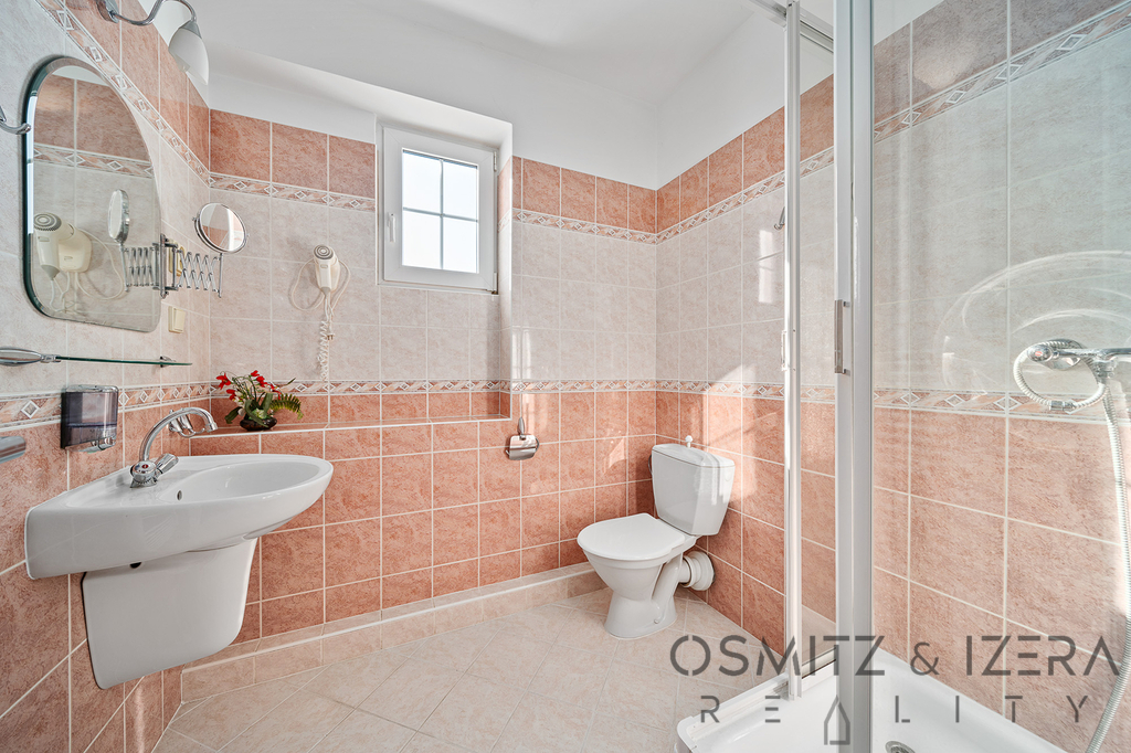 • Nadzemní podlaží: 12 pokojů + 1 apartmán, každý s vlastním sociálním zařízením, 5 pokojů s balkónem.