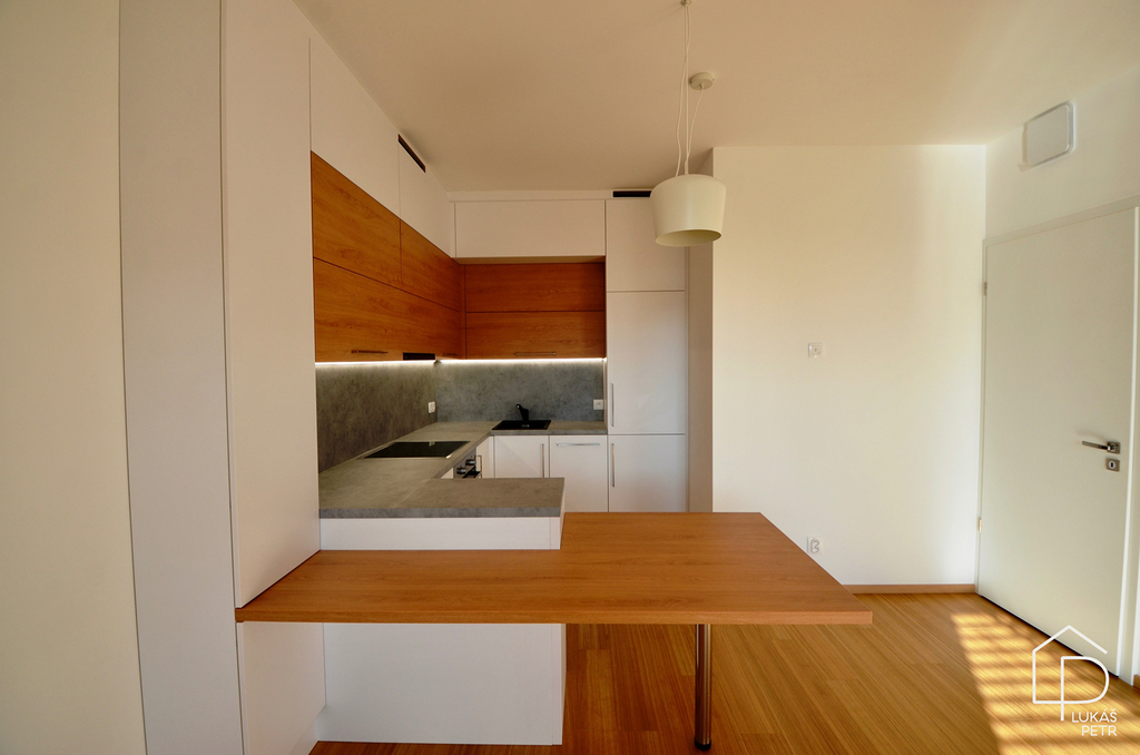 V bytě jsou dřevěné podlahy, kuchyňská linka je provedena v moderním standardu a koupelna je vybavena elektrickým podlahovým vytápěním. Úložné prostory řeší vestavěné skříně v ložnici i na chodbě, takže není nutné zabírat prostor dalšími kusy nábytku.