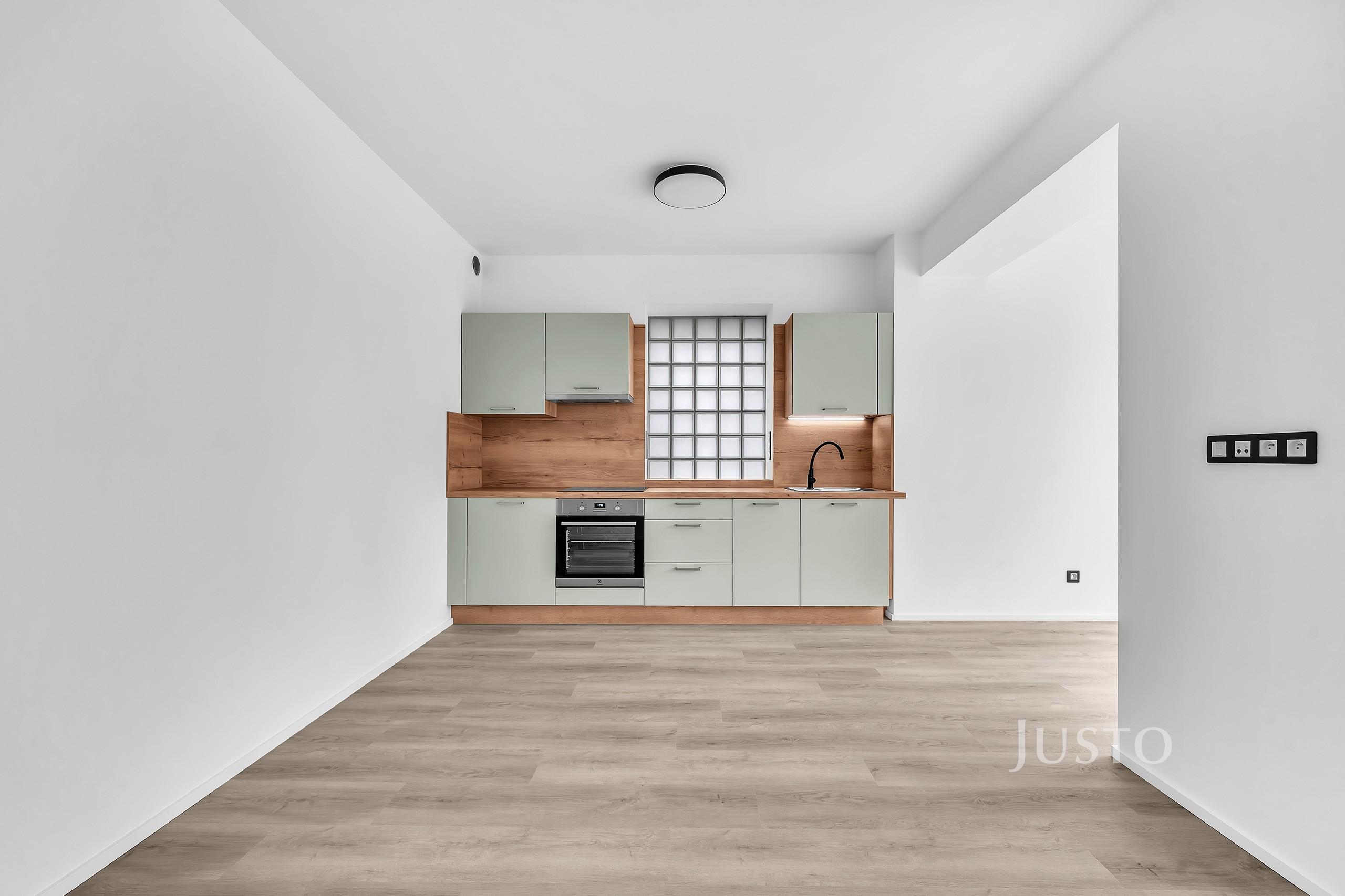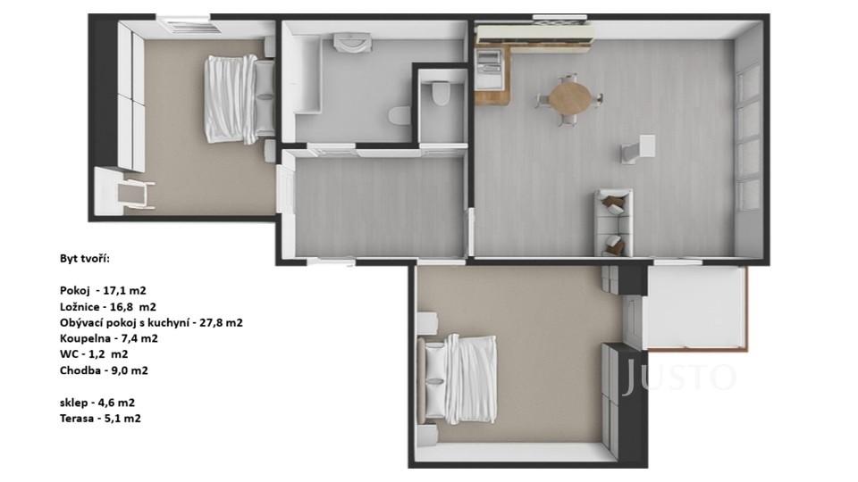 Dispozice bytu nabízí komfortní obývací pokoj s kuchyňským koutem (27,8 m²), dvě neprůchozí ložnice (17,1 m² a 16,8 m²), koupelnu (7,4 m²) vybavenou vanou i sprchovým koutem, samostatné WC (1,2 m²) a prostornou chodbu (9 m²). Kuchyňská linka je zhotovena na míru a je vybavena lednicí, mrazákem, myčkou a elektrickou varnou deskou. Byt je nabízen nevybavený, což umožňuje novým nájemcům zařídit si interiér dle vlastních představ.