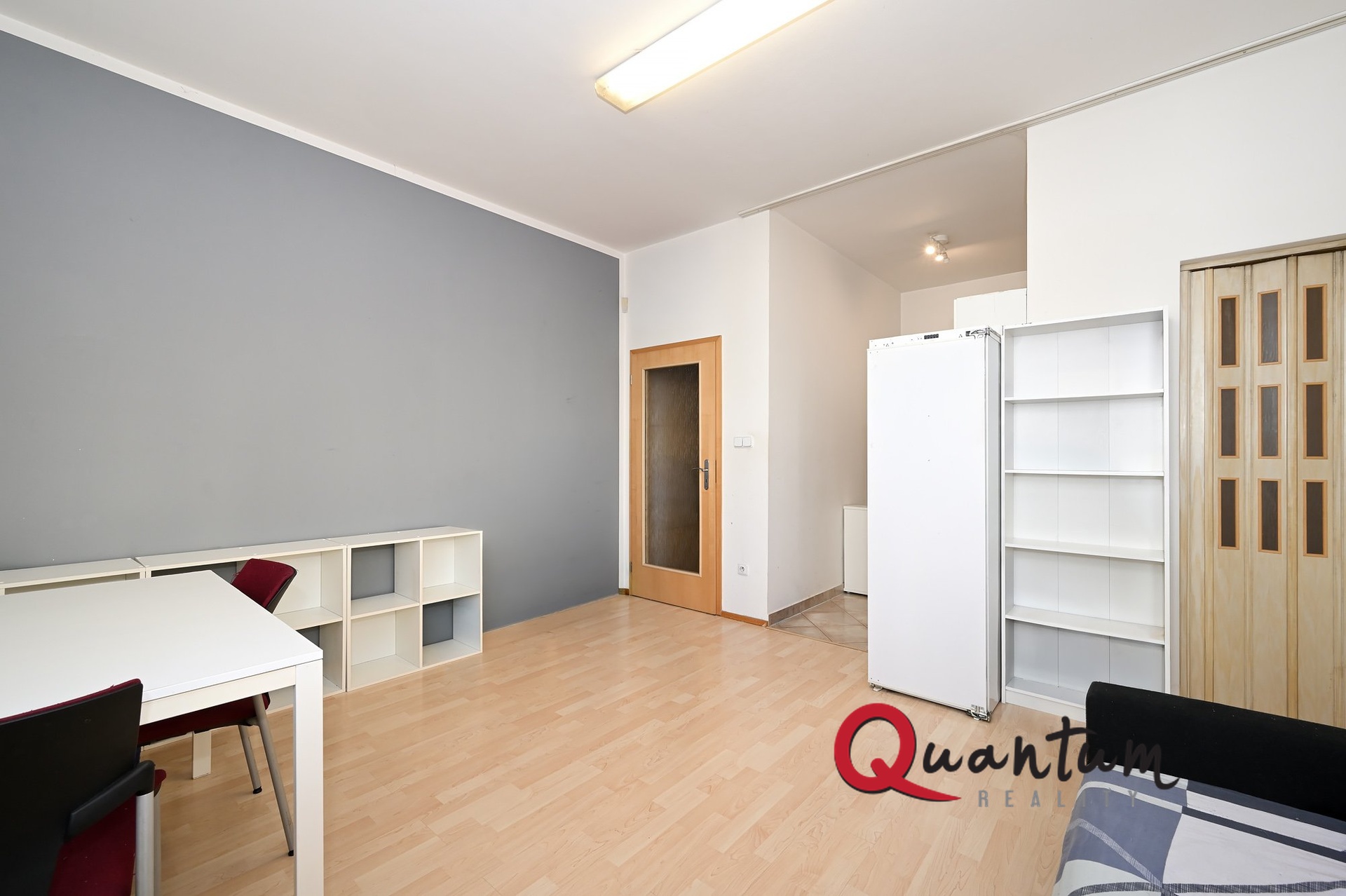 Jednotka o dispozici 1+kk se skládá z předsíně, koupelny s vanou a toaletou a hlavní obytné místnosti s kuchyňským koutem (včetně malé lednice). Součástí je také praktická šatna, kterou lze využít jako komoru nebo menší ložnici. Byt se nabízí nezařízený.