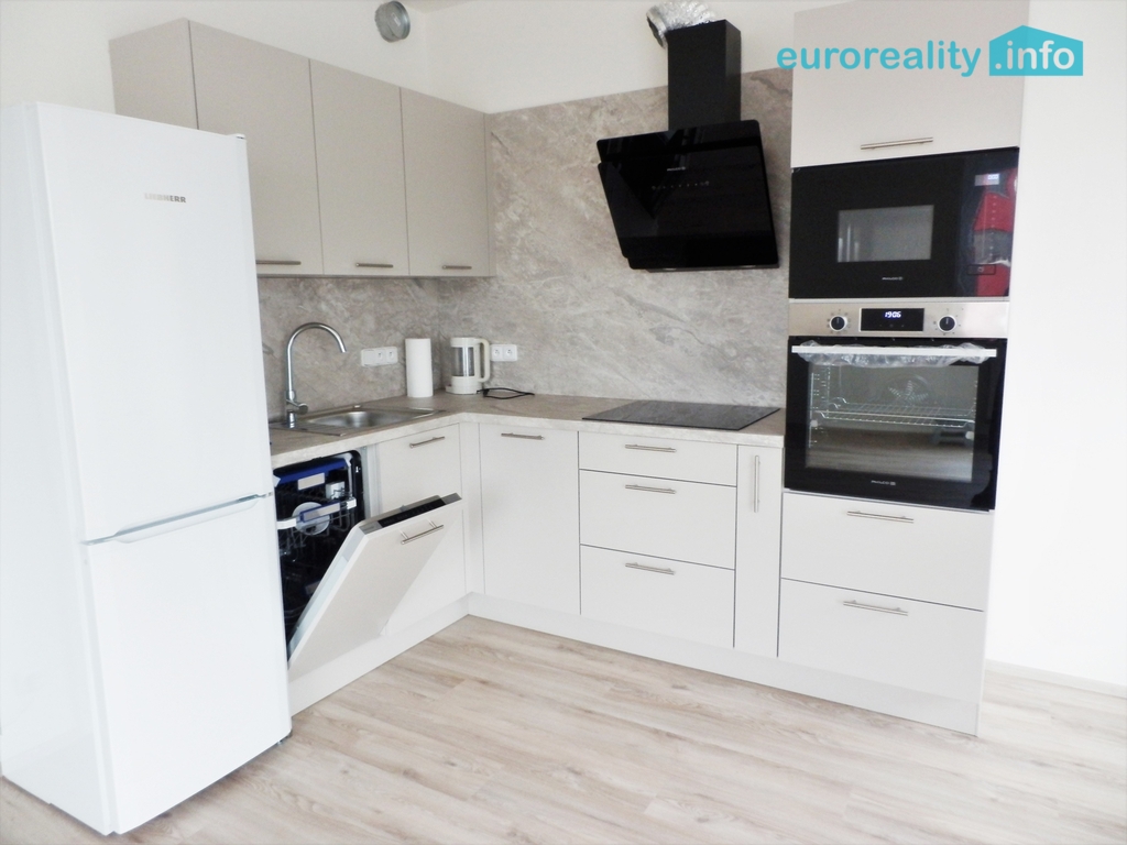 K pronájmu se nabízí vybavený kuchyňskou linkou s myčkou, elektrickým sporákem a indukční deskou, elektrickou troubou, mikrovlnkou, lednicí a digestoří. V komoře je zapojená pračka. Všechno vybavení je samozřejmě nové.