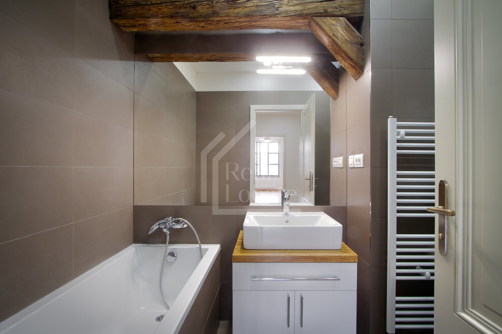 Jedná se o podkrovní byt o celkové rozloze 88m2. V bytě je dostatek denního světla. Je zde kompletně vybavena moderní kuchyně se všemi spotřebiči - digestoř, varná deska, elektrická trouba, myčka, lednice s mrazákem. Bytová jednotka má elegantní a rustický nádech doplněný dřevěnými krovy. Byt je velice prostorný a chytře oddělen na různé sekce - ložnice není oddělena dveřmi od obývacího prostoru. Prostorná kuchyně včetně obývacího pokoje a koupelna s vanou. Byt se pronajímá nezařízený.