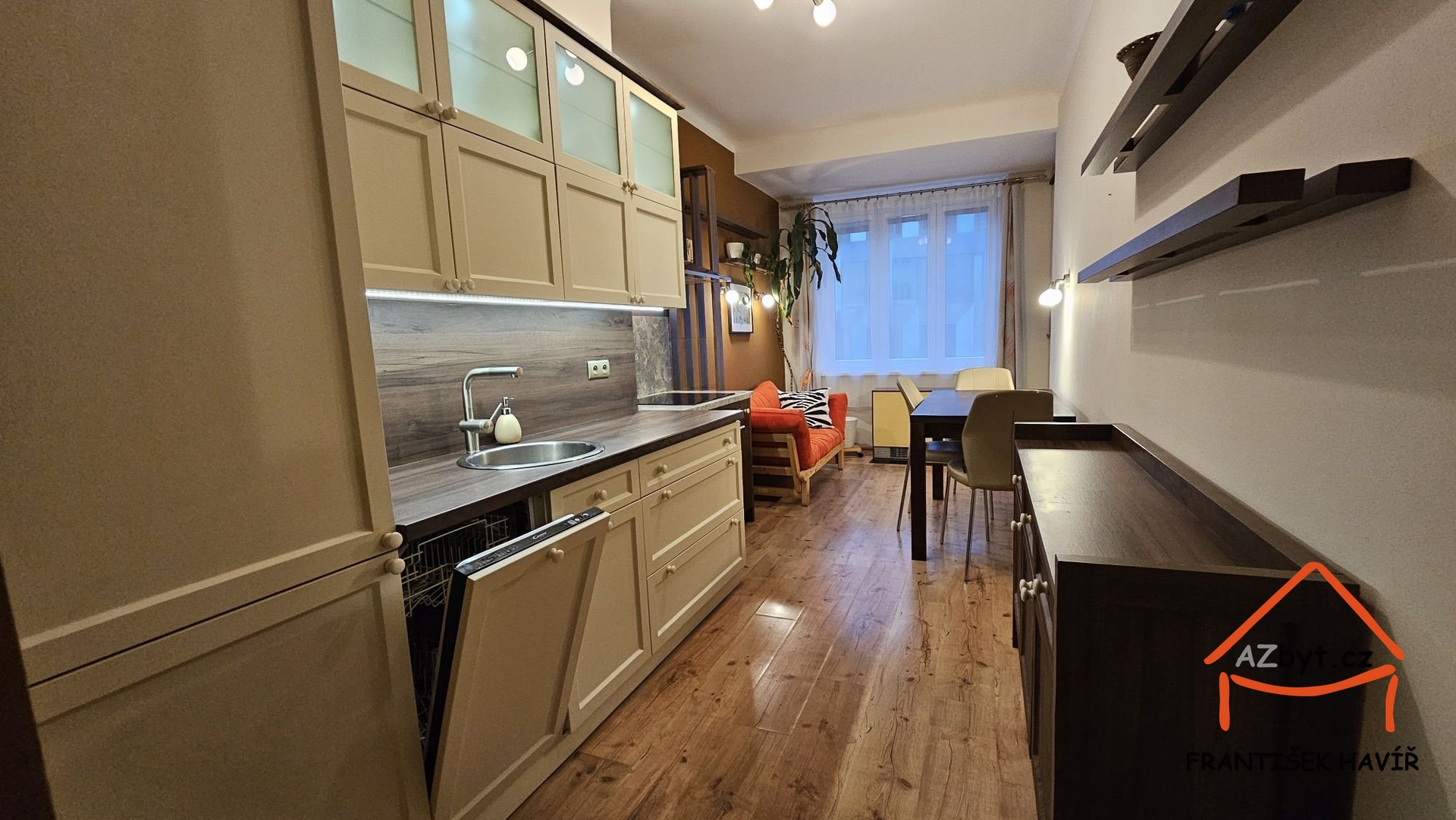 Kuchyňský kout je vybaven vestavěnými spotřebiči: indukční varná deska s digestoří, horkovzdušná trouba, myčka nádobí, lednice s mrazákem.