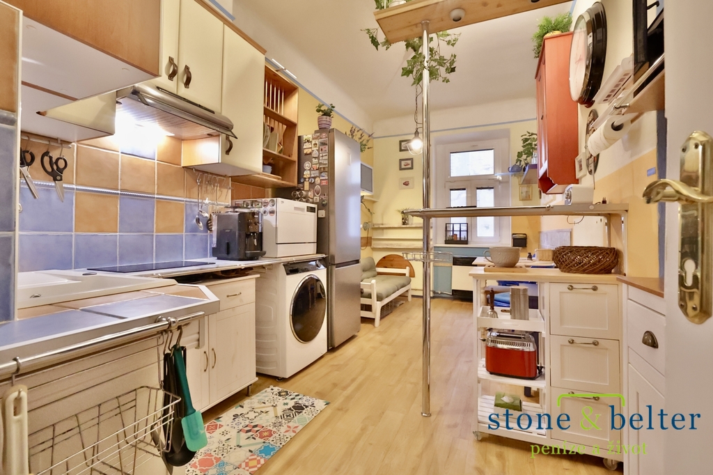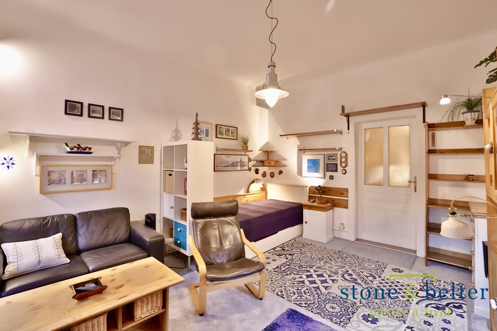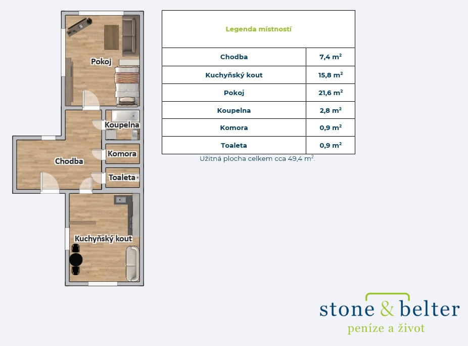 Světlý byt 1+1 o rozloze 49 m² umístěn ve 4 patře domu s výtahem překvapí klidem i praktičností. Dominantou je velkorysý obývací pokoj 21,6 m². Samostatná kuchyně 15,8 m², která s přehledem pojme posezení i jídelní stůl. Navazuje komora 0,9 m² a v centrální chodbě (7,4 m²) se nachází i koupelna 2,8 m² a samostatné WC 0,9 m².
