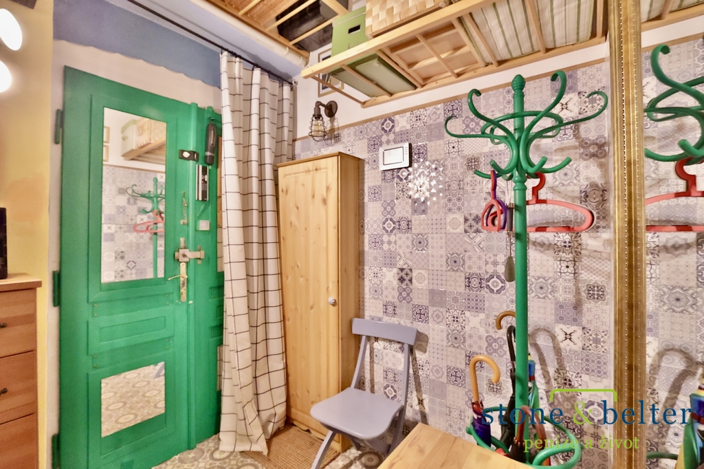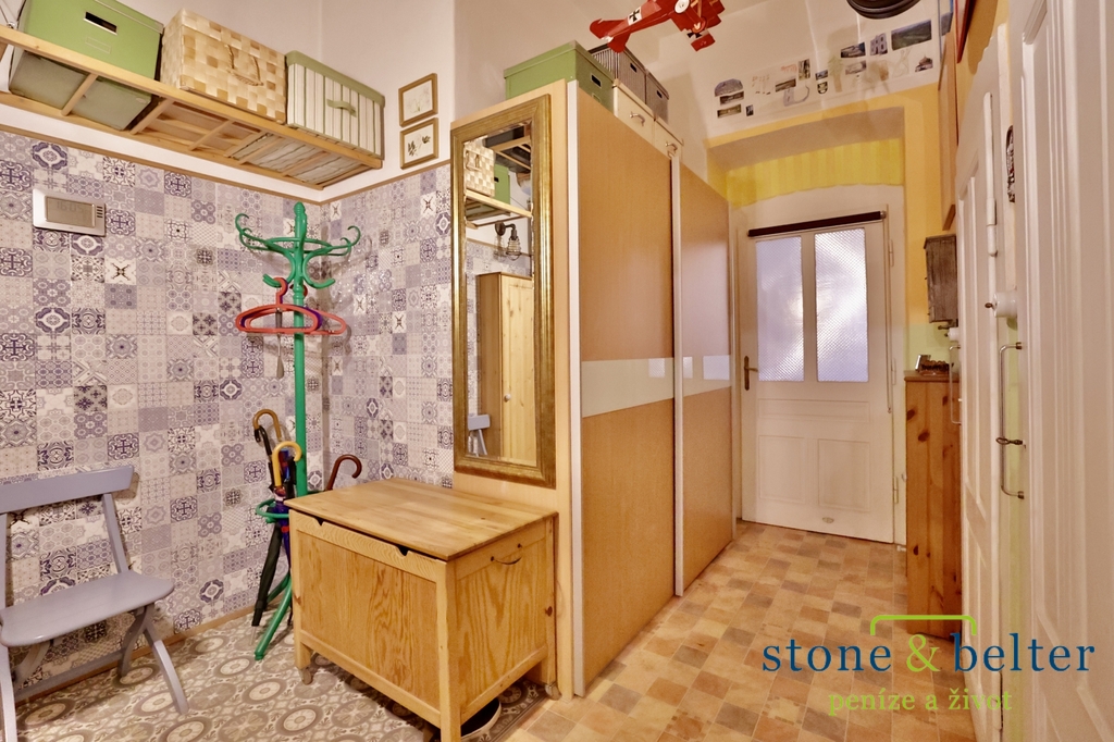 - V bytě se nachází komora s regály a vysoké stropy poskytují dostatek odkládacího prostoru.