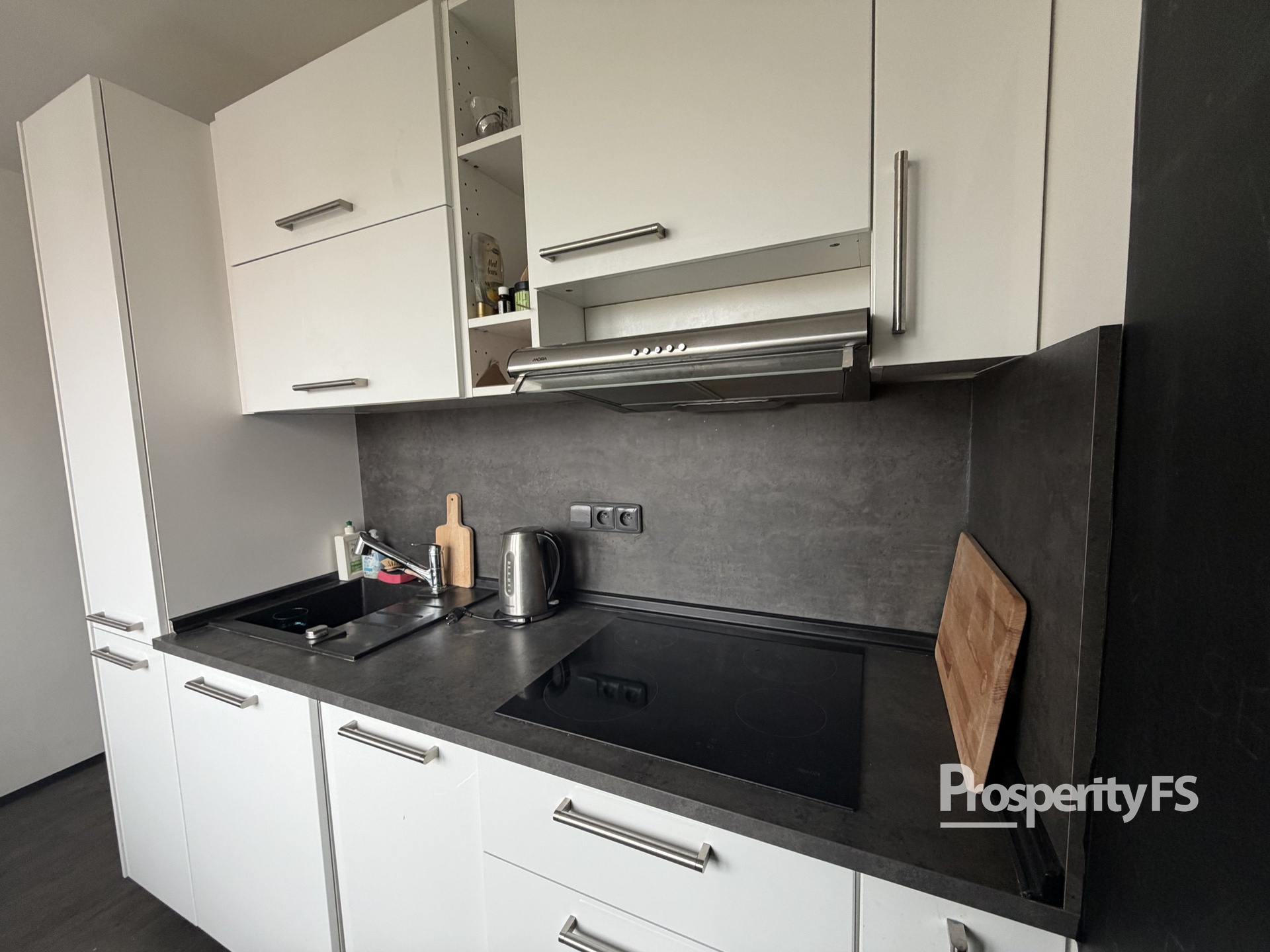 Kuchyň je plně vybavena nejen elektrickými spotřebiči, ale i kompletním nádobím, které zůstává k dispozici novému nájemníkovi. Byt je tak připraven k okamžitému nastěhování bez nutnosti dalších investic.