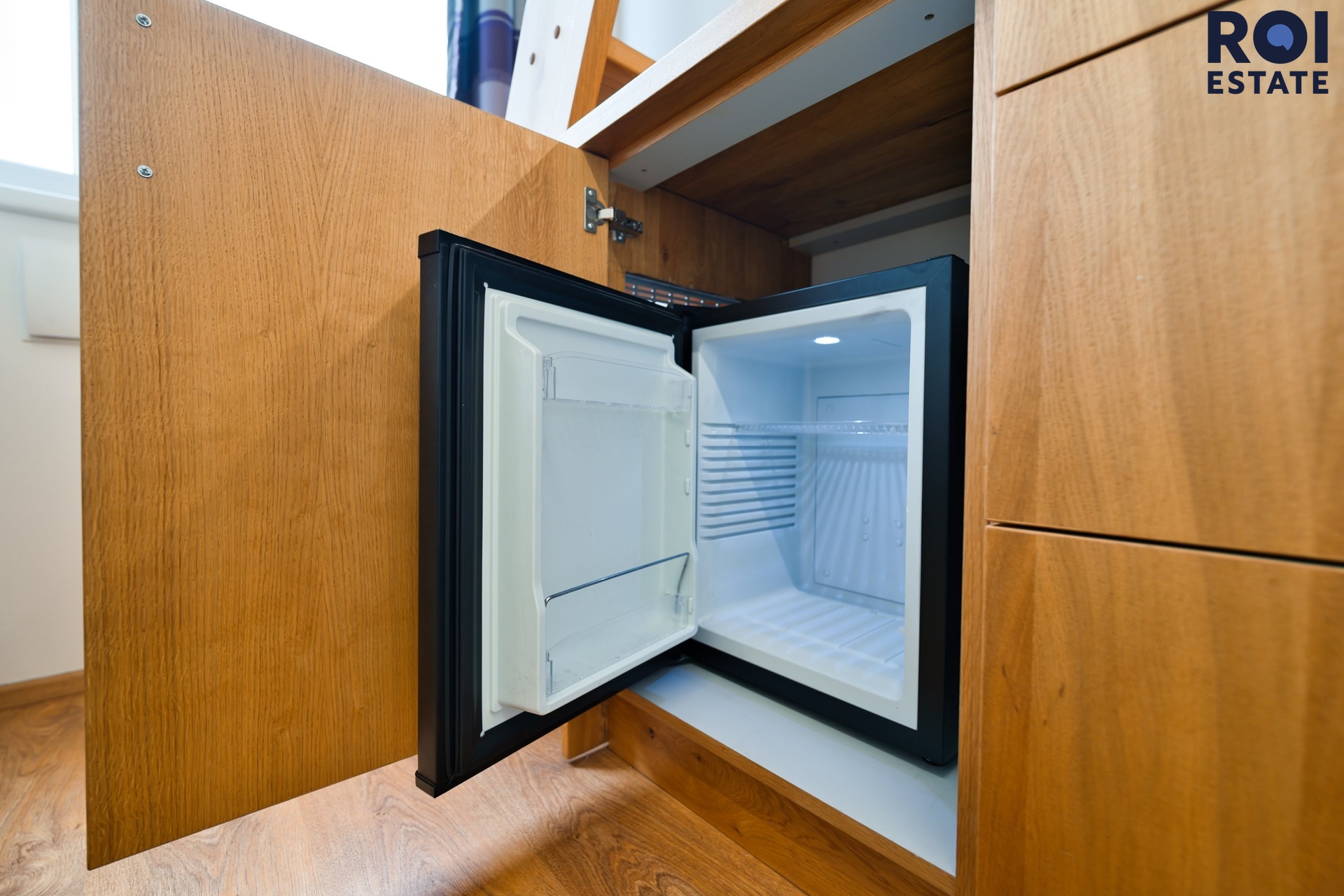 Byt je vybaven, v kuchyni je malá lednička, varná deska, digestoř. MW. V koupelně je sprchový kout. Zvýšené patro na spaní.
