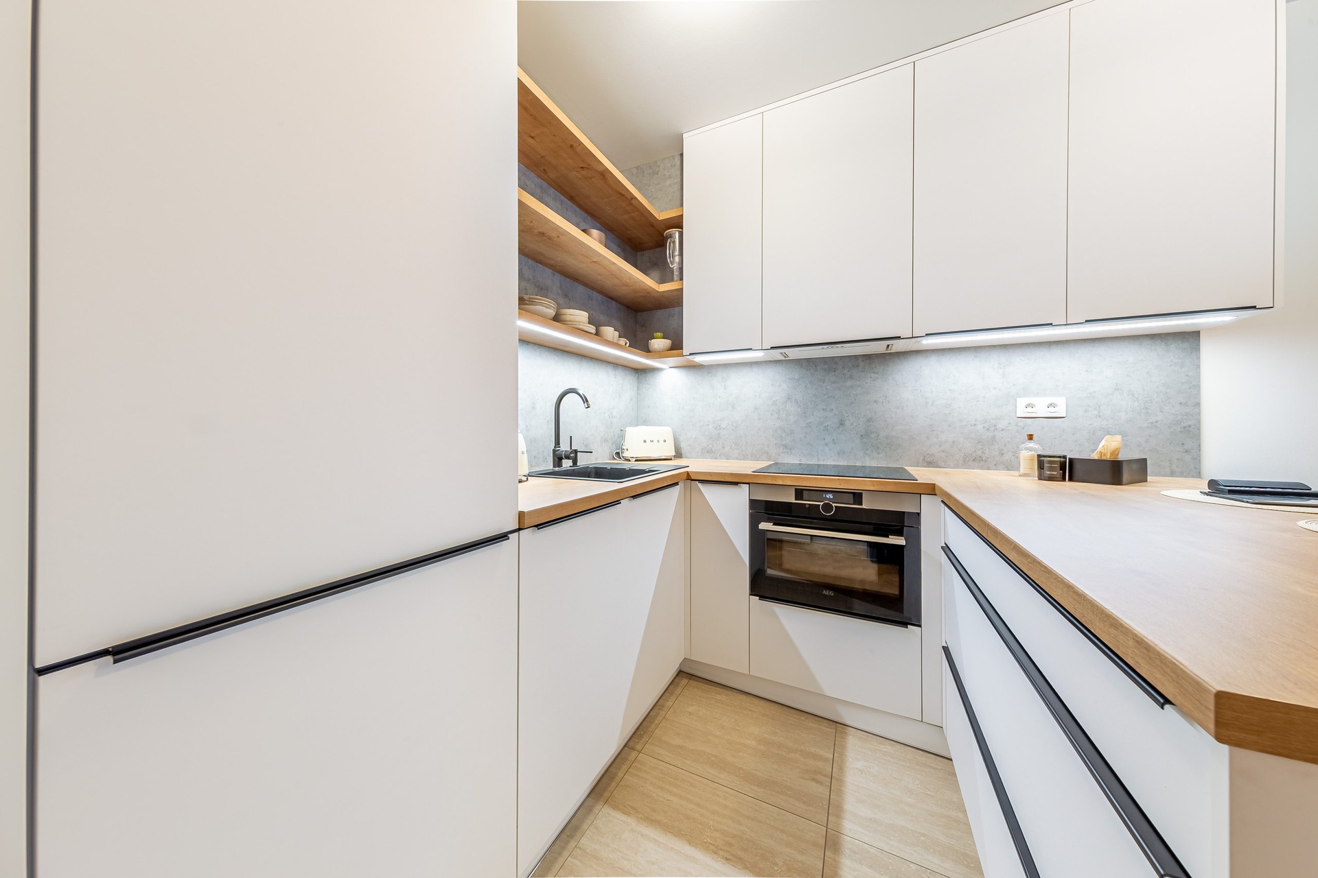 Nábytek v bytě zhotovován na míru, použity kvalitní materiály, přístroje i zařizovací předměty. Obytný pokoj je vybaven klimatizací.