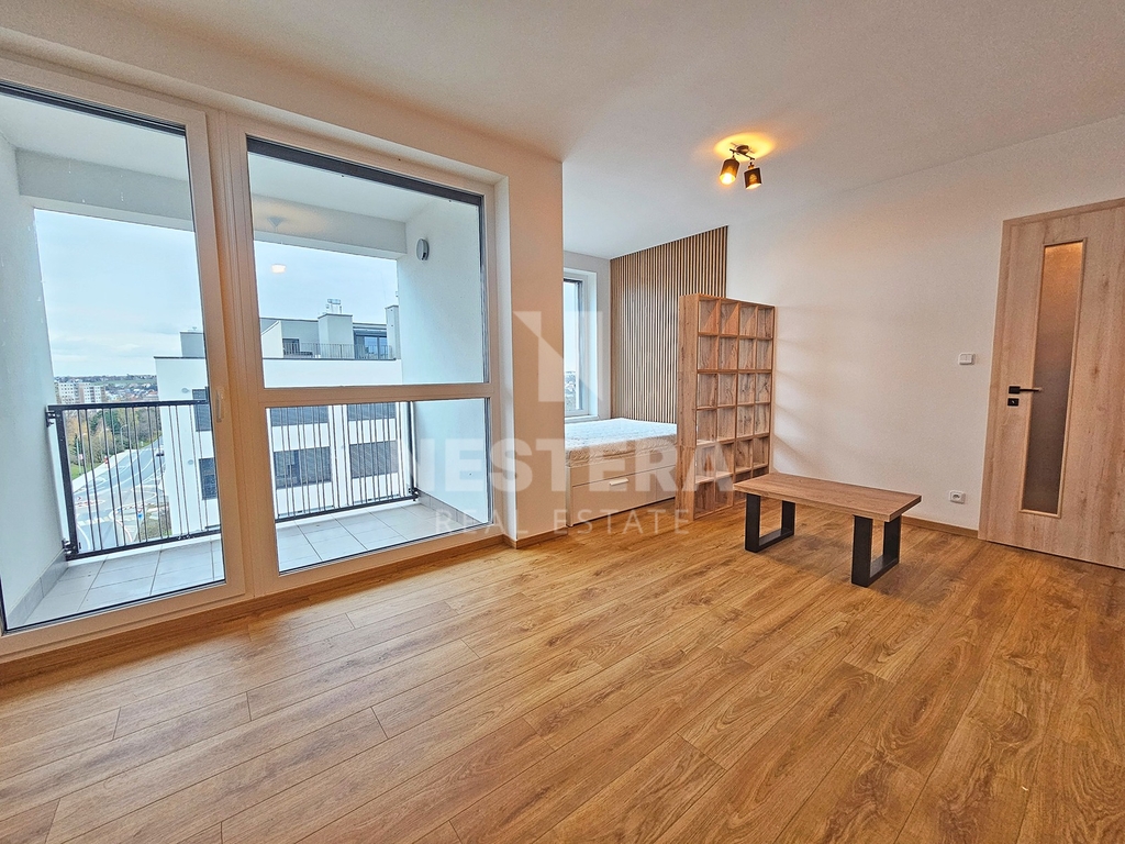 Byt je prakticky rozčleněn na prostornou chodbu s šatní skříní, koupelnu s vanou a toaletou a velký, světlý pokoj (23 m², orientace na jihovýchod) s moderním plně vybaveným kuchyňským koutem. Z pokoje je přímý vstup na lodžii o velikosti 5 m².