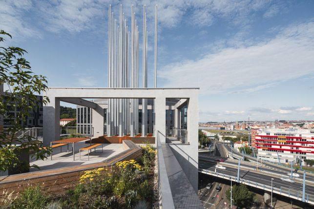 Velkým benefitem je přístup na společnou střešní terasu s krásným panoramatickým výhledem na Prahu.