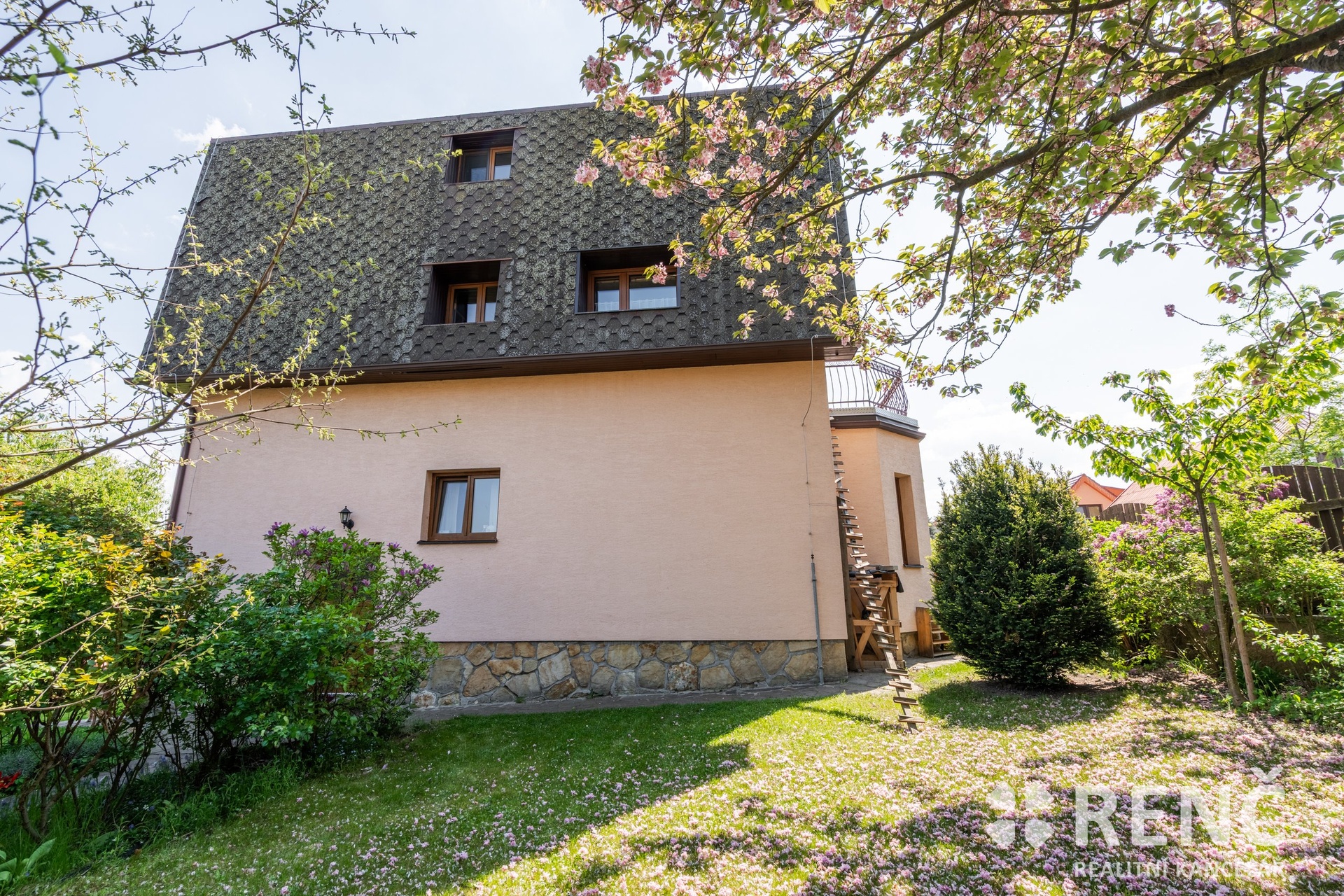 Dům je umístěný na prostorném rovinatém pozemku. Okolo domu se rozkládá udržovaná zahrada se vzrostlými stromy. Část zahrady lze užívat jako místo pro odpočinek, rodinná setkání či dětské hry.