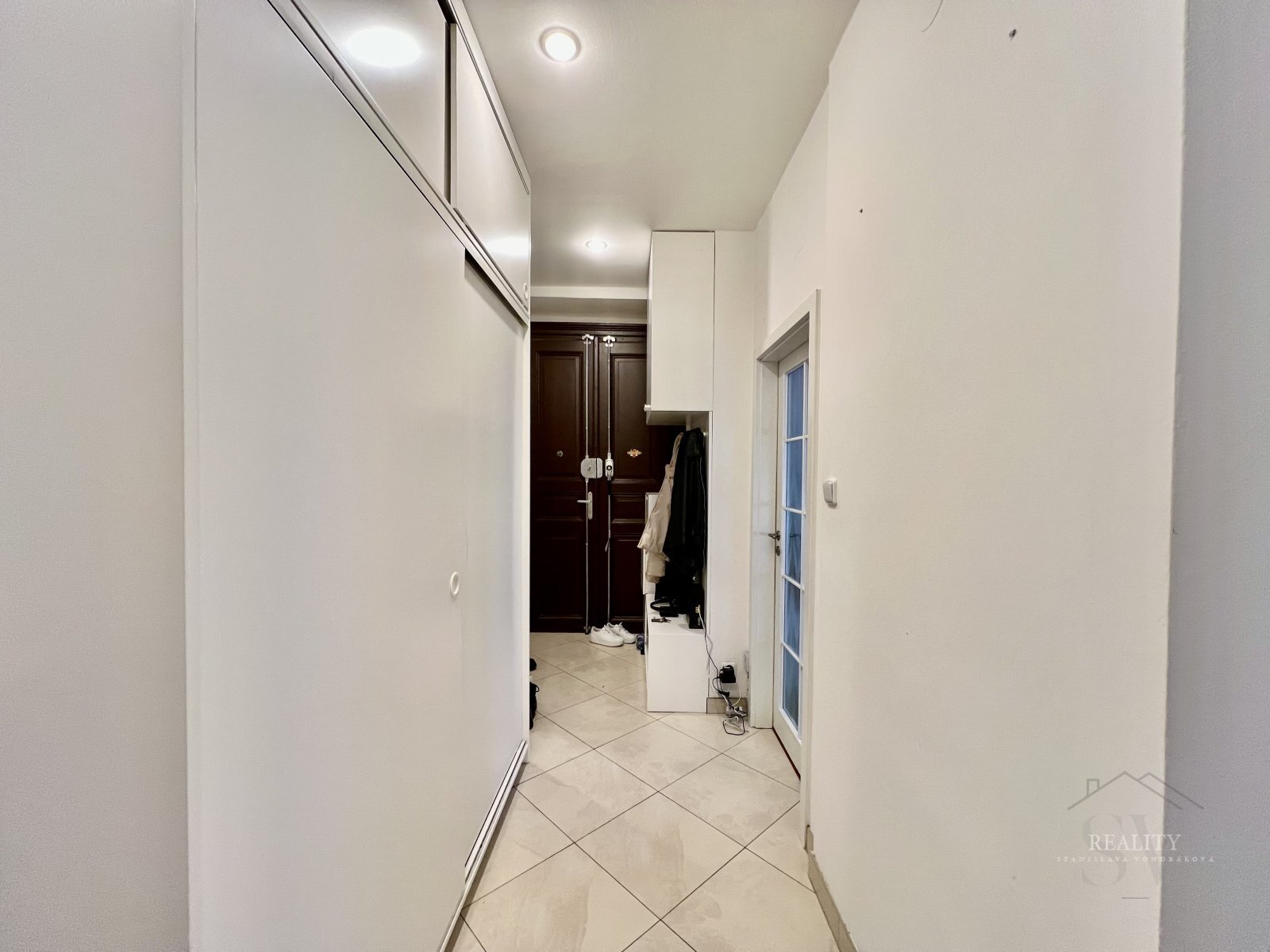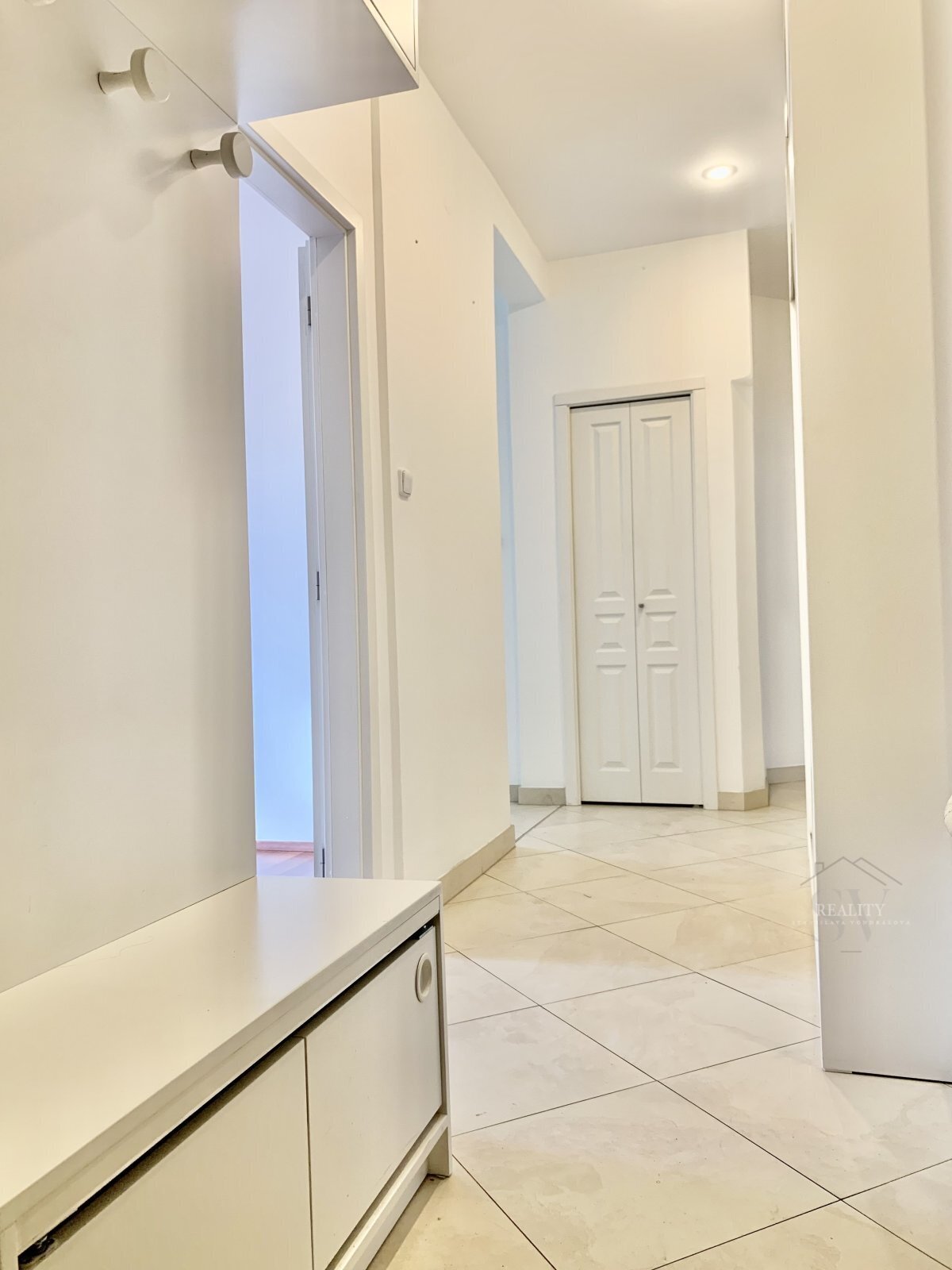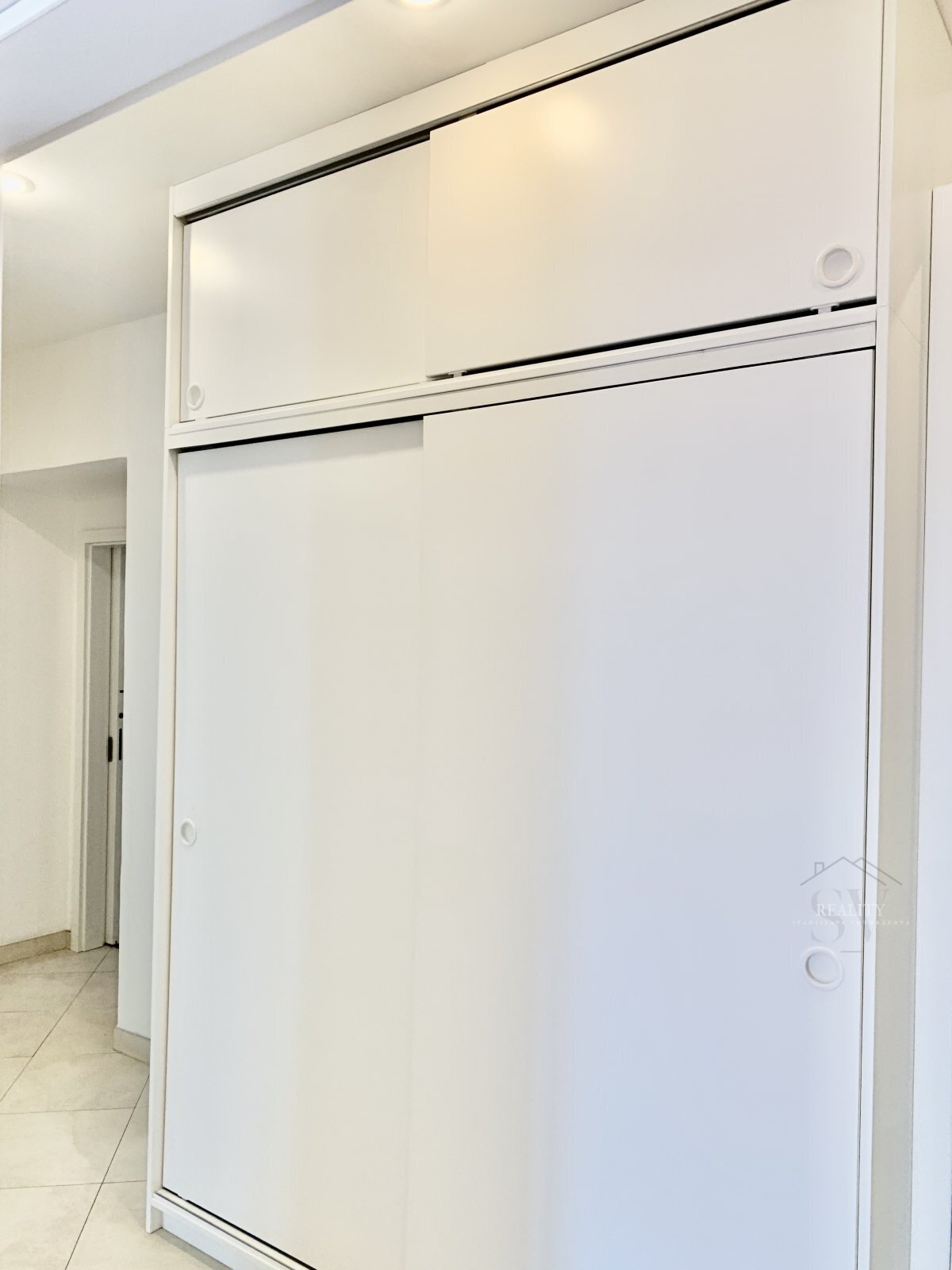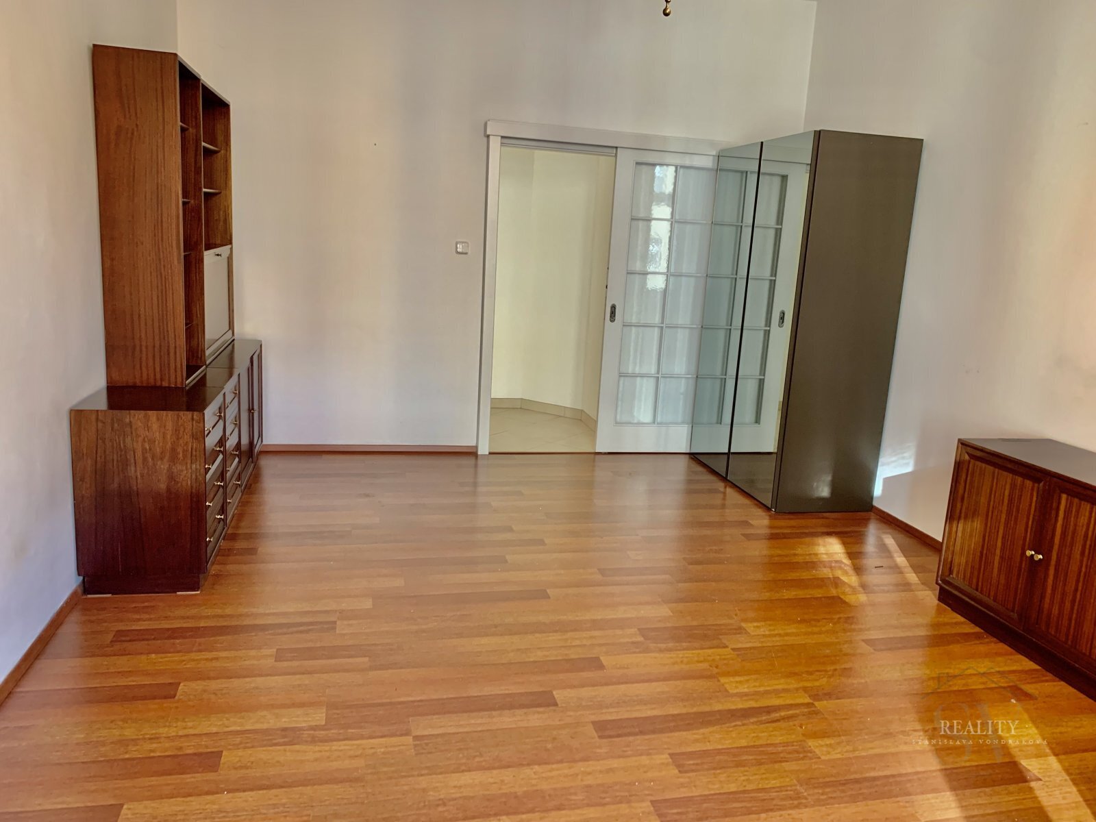 Vstupní chodba/hala disponuje velkou vestavěnou skříní, další zrcadlová skříň je v obývacím pokoji a v ložnici zůstává kvalitní policová stěna na míru. Kuchyňský kout je vybaven menší vestavěnou lednicí a dvouplotýnkou.