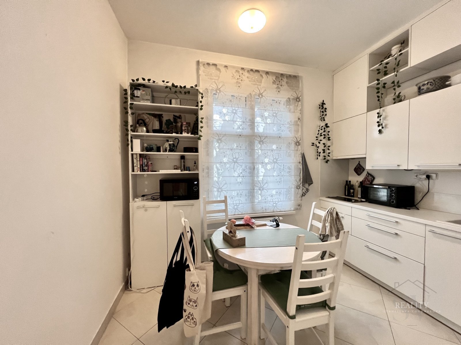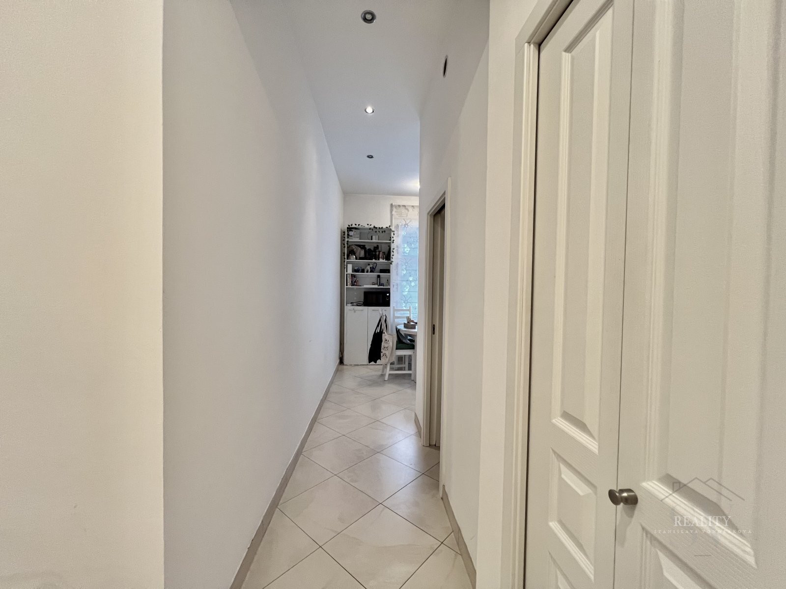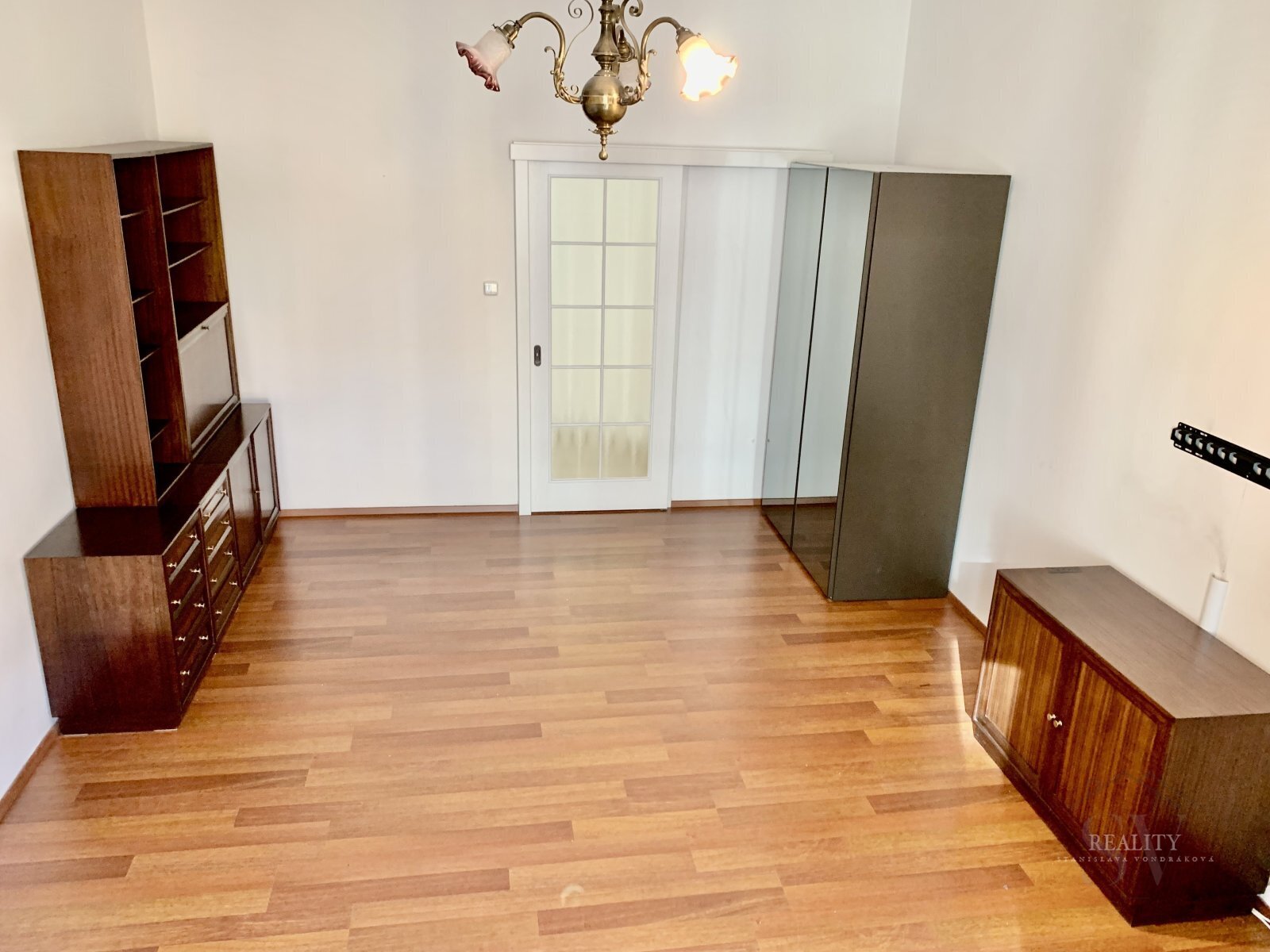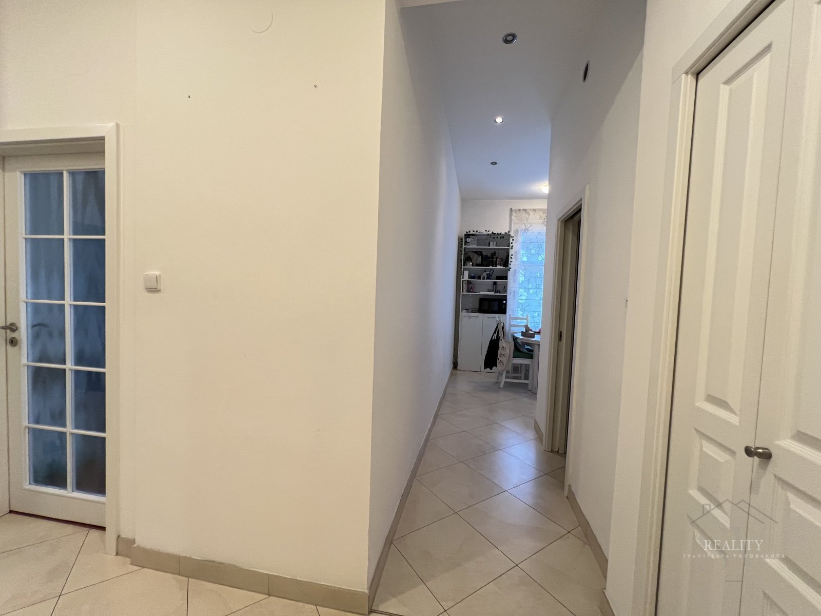 Vstupní chodba/hala disponuje velkou vestavěnou skříní, další zrcadlová skříň je v obývacím pokoji a v ložnici zůstává kvalitní policová stěna na míru. Kuchyňský kout je vybaven menší vestavěnou lednicí a dvouplotýnkou.