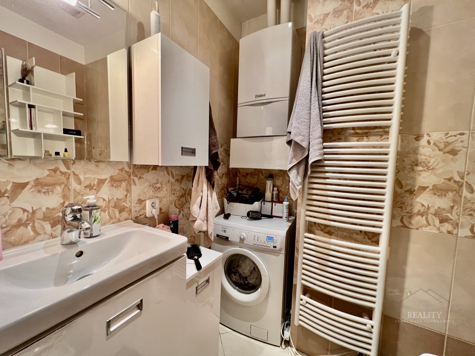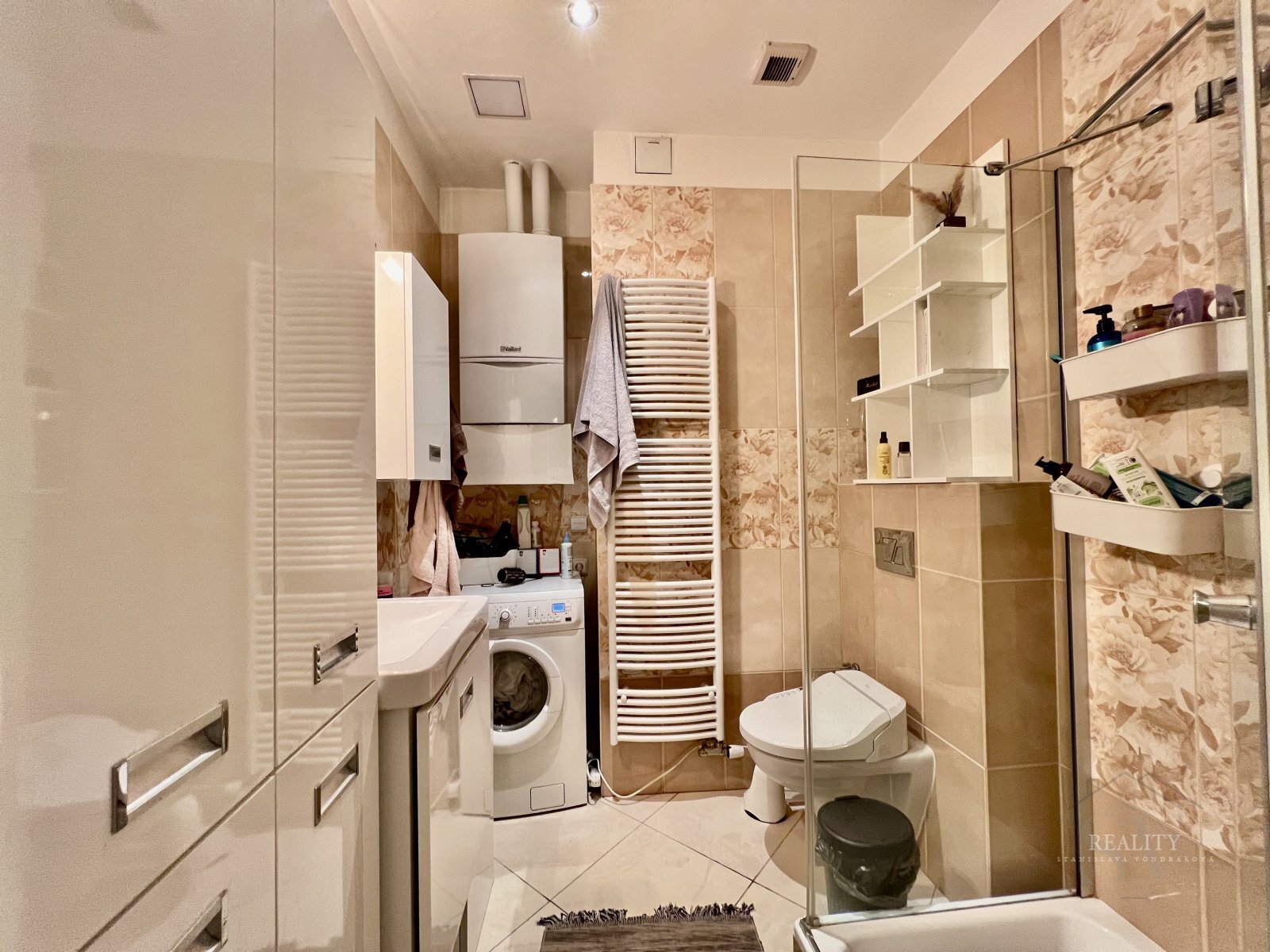 Dispozice bytu je velmi praktická — jednotlivé místnosti jsou propojeny chodbou, ze které je vstup do koupelny se sprchovým koutem a WC, a také do samostatné šatny/komory, která nabízí další vítaný úložný prostor. V koupelně je k dispozici pračka. Vytápění bytu zajišťuje vlastní plynový kotel.
