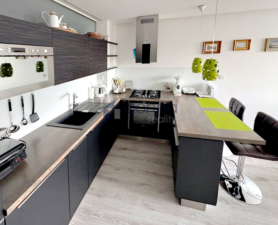 - obývací pokoj s velkou kuchyňskou linkou a spotřebiči (myčka nádobí, lednice, varná deska, pečící trouba, mikrovln. trouba + další menší