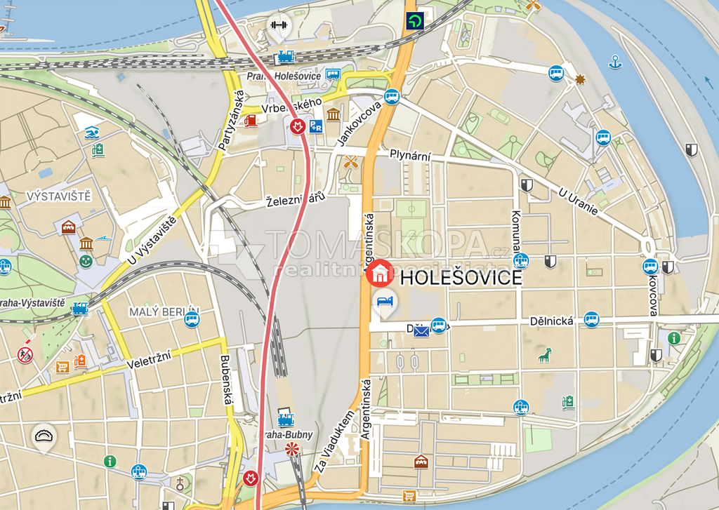 Nabízený byt se nachází v žádané části Holešovic s výbornou dopravní dostupností. Tramvajová zastávka je v pěší vzdálenosti, metro Vltavská a Nádraží Holešovice jsou několik minut od domu. V blízkosti je též vlakové nádraží Praha – Bubny. V okolí se nachází veškerá občanská vybavenost – supermarkety, lékárny, drogerie, restaurace, kavárny, obchodní centrum Stromovka. Lokalita nabízí také množství možností pro volný čas, včetně parků Stromovka a Letenské sady.