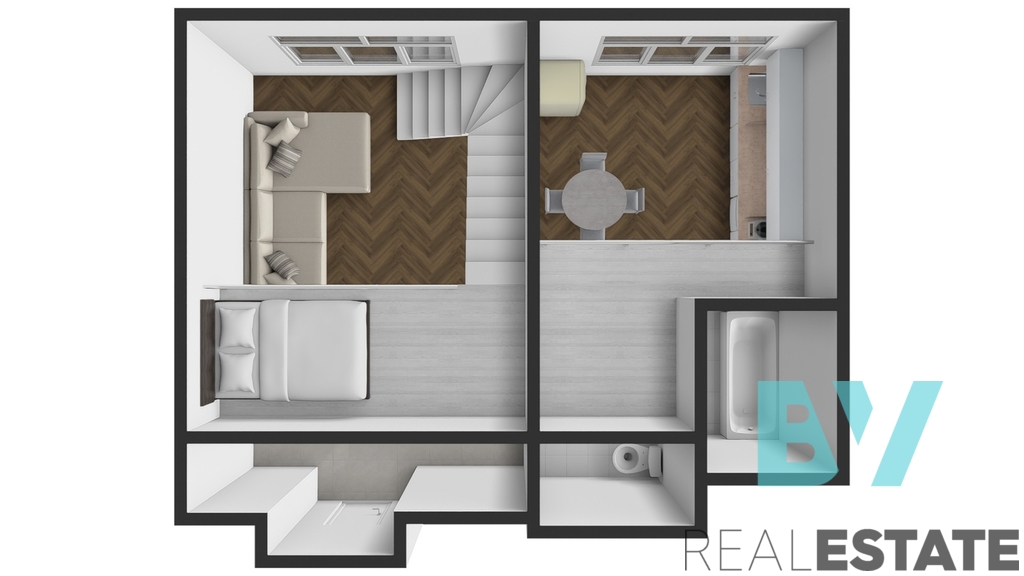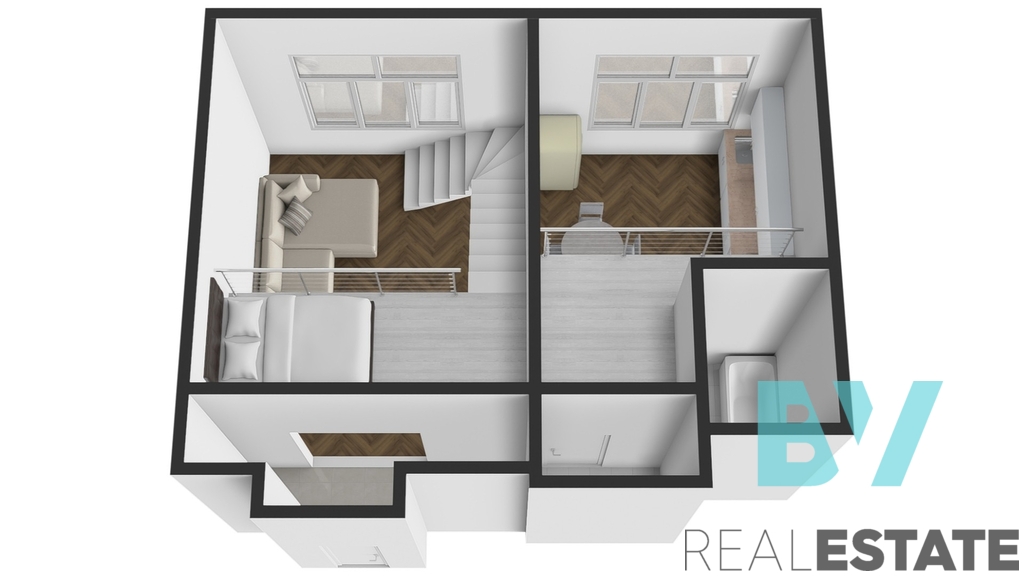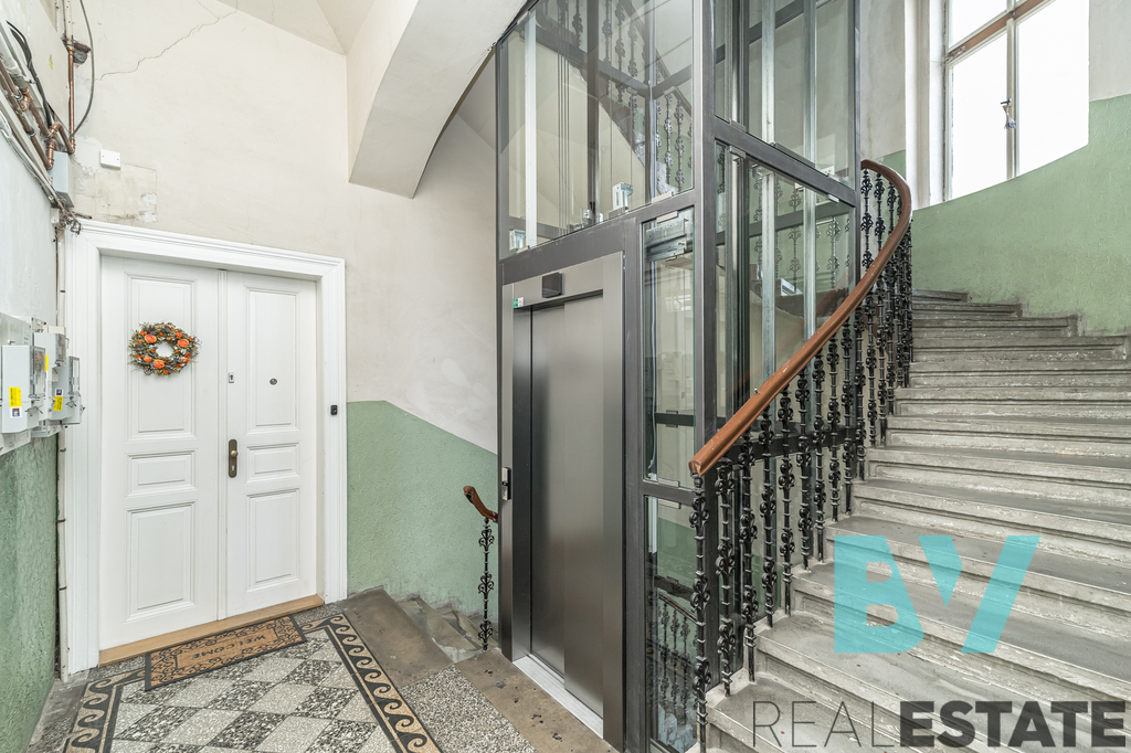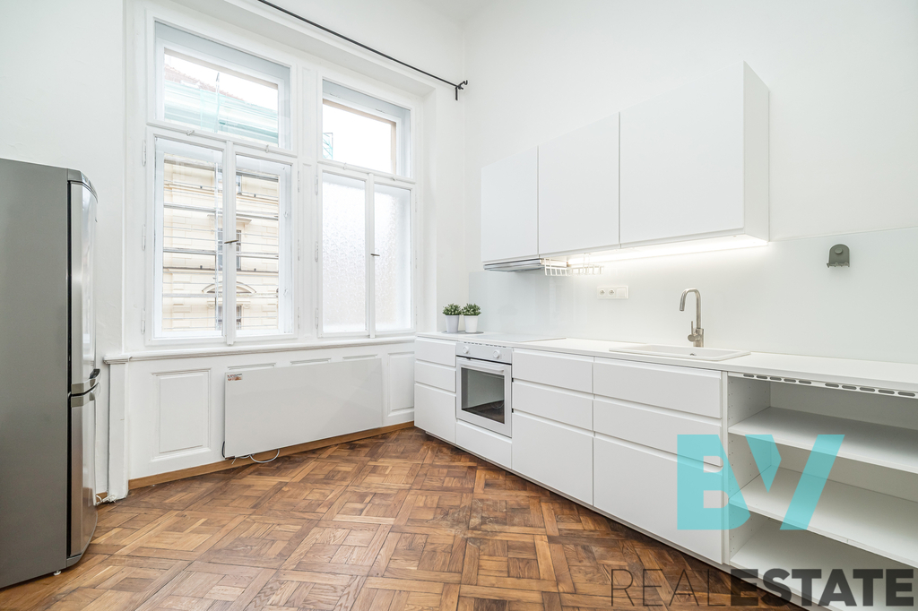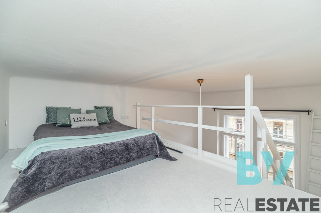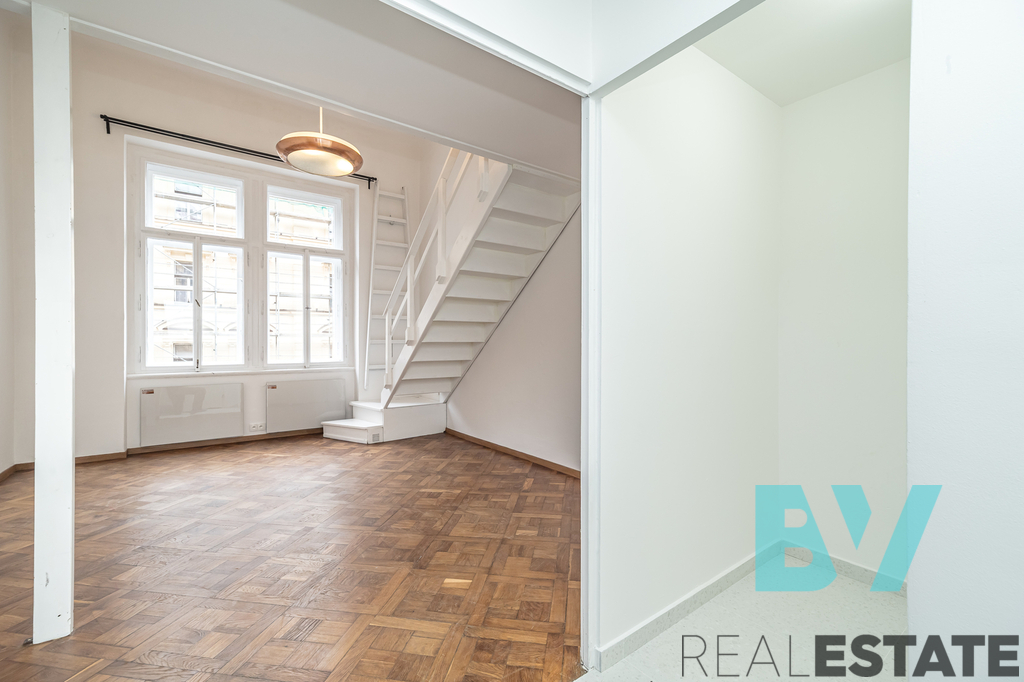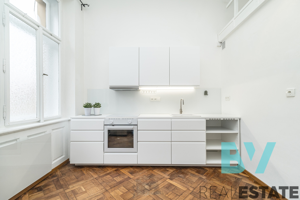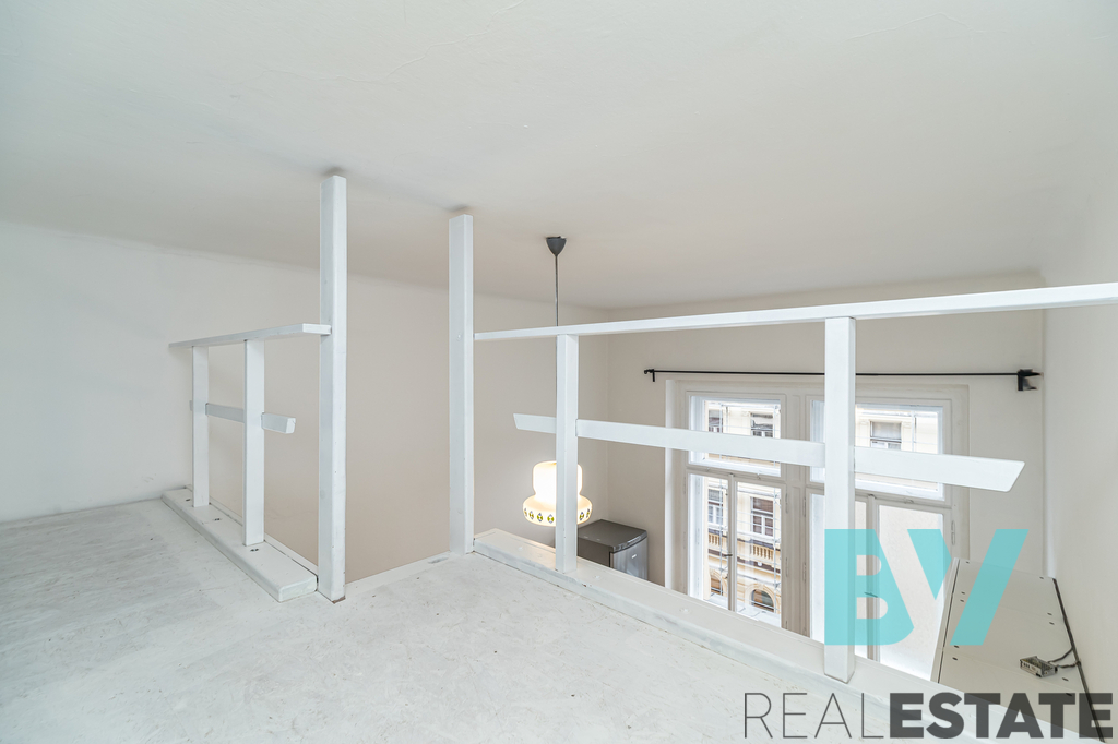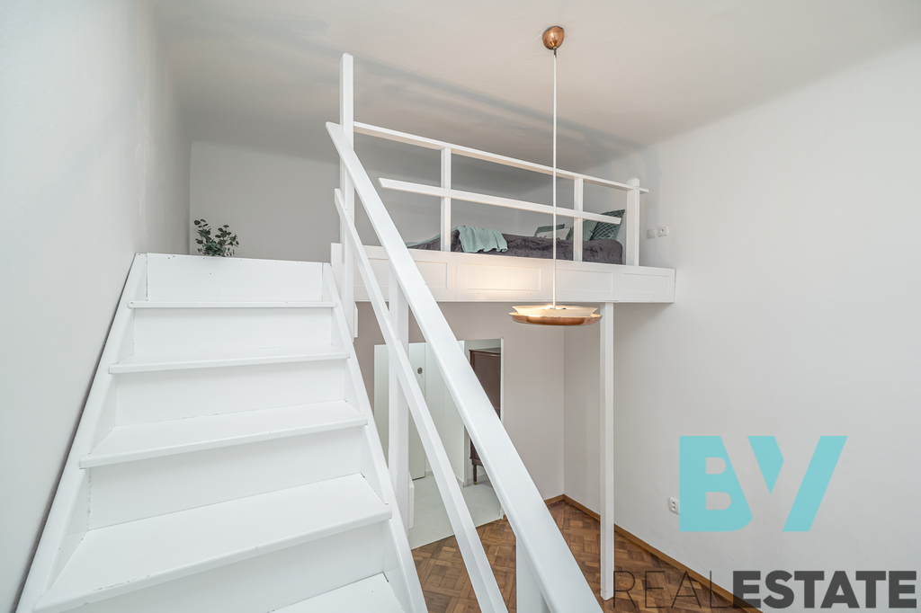 Byt zaujme vysokými stropy a otevřeným loftovým prostorem – nad obývacím pokojem je vybudované pohodlné patro na spaní. V samostatné kuchyni je nová bílá linka s varnou deskou, troubou a lednicí, na podlaze původní parkety. Koupelna s vanou, umyvadlem, toaletou a pračkou, technické zázemí v předsíni. Vytápění je řešeno elektrickými přímotopy.