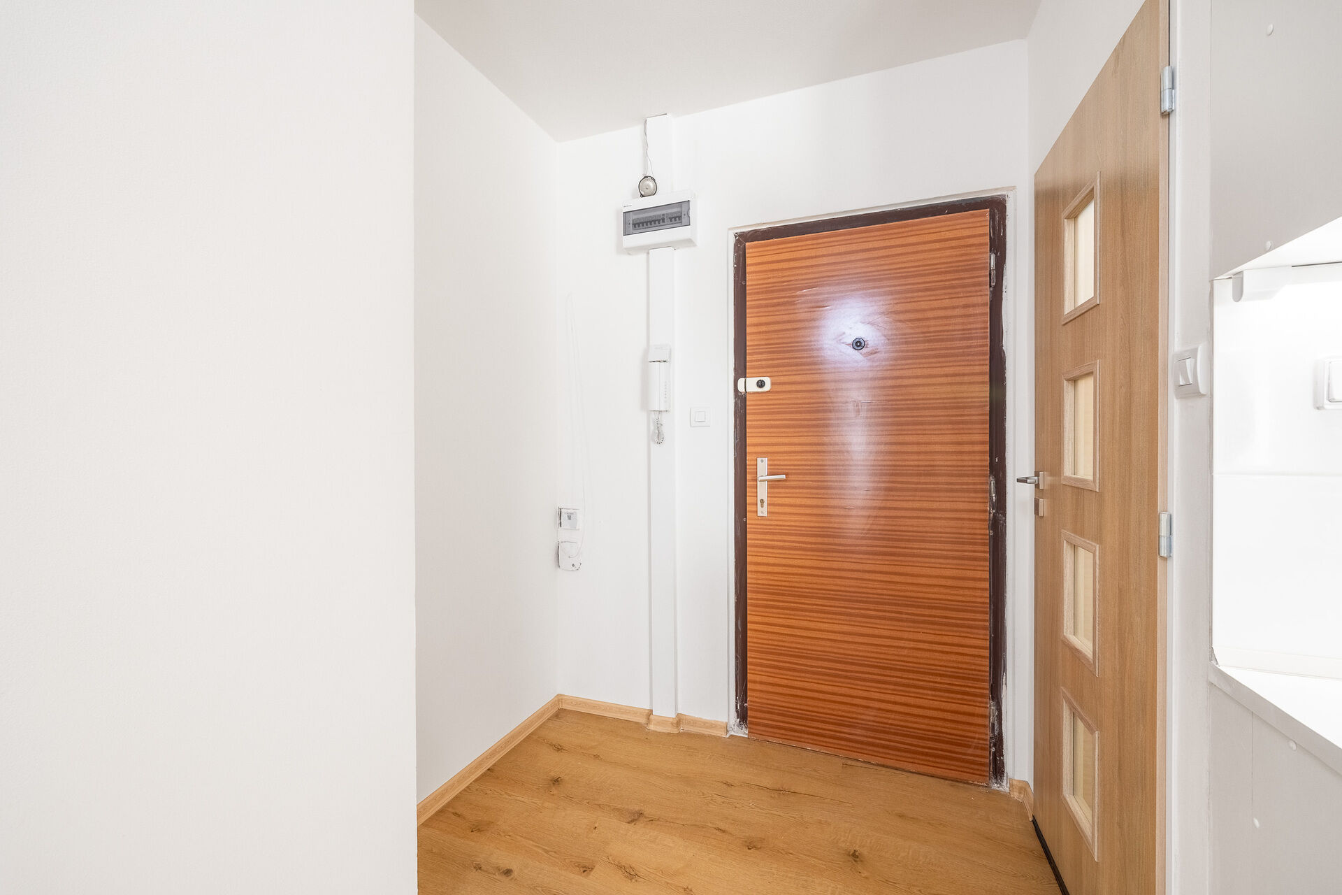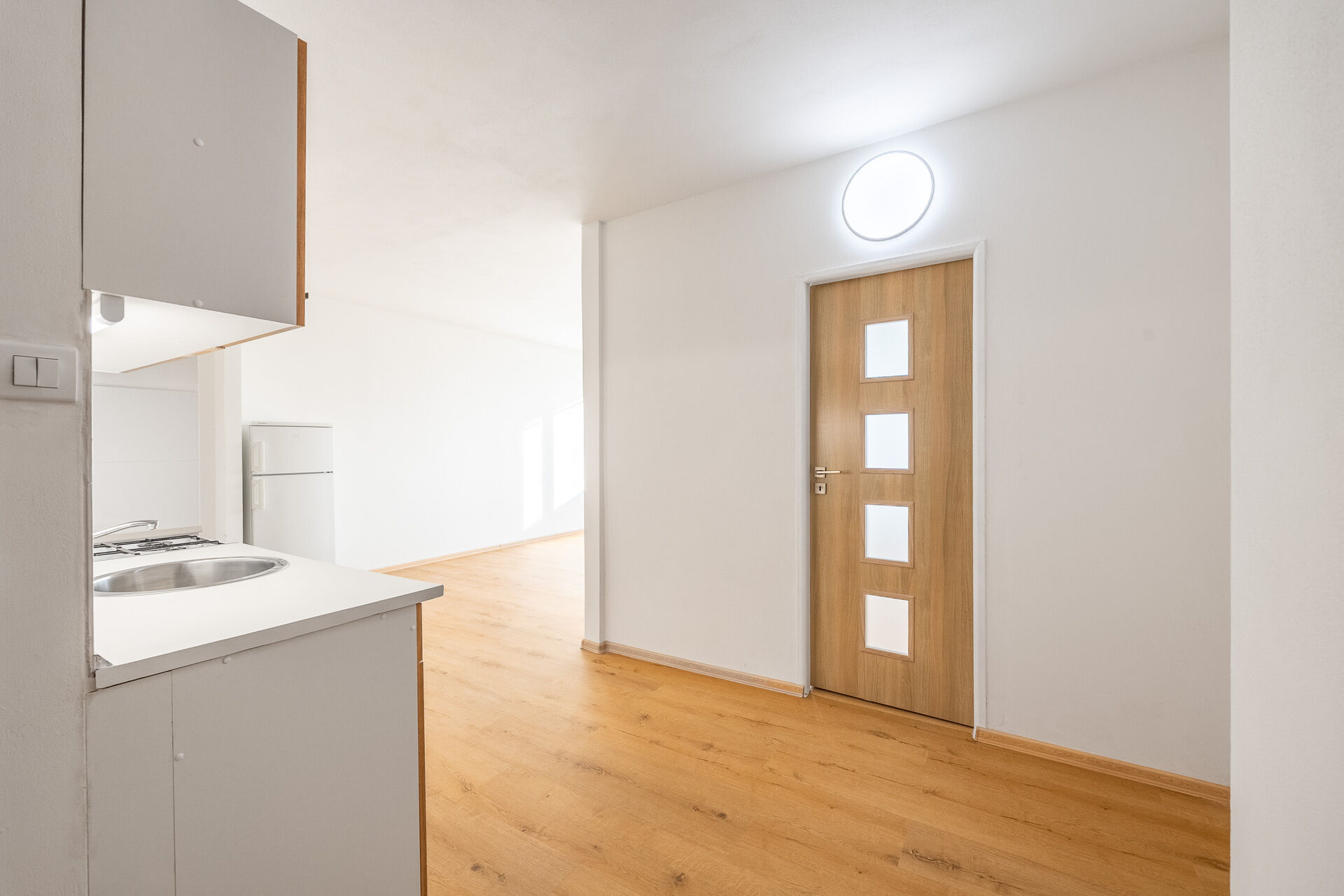 Při vstupu do bytu se ocitneme v prostorném zádveří, které byt rozděluje na dva samostatné a neprůchozí pokoje, kde jeden je jako ložnice a druhý jako obývací pokoj s kuchyňským koutem, který je vybaven: linkou se spotřebiči (kombinovaný sporák, digestoří, lednicí).