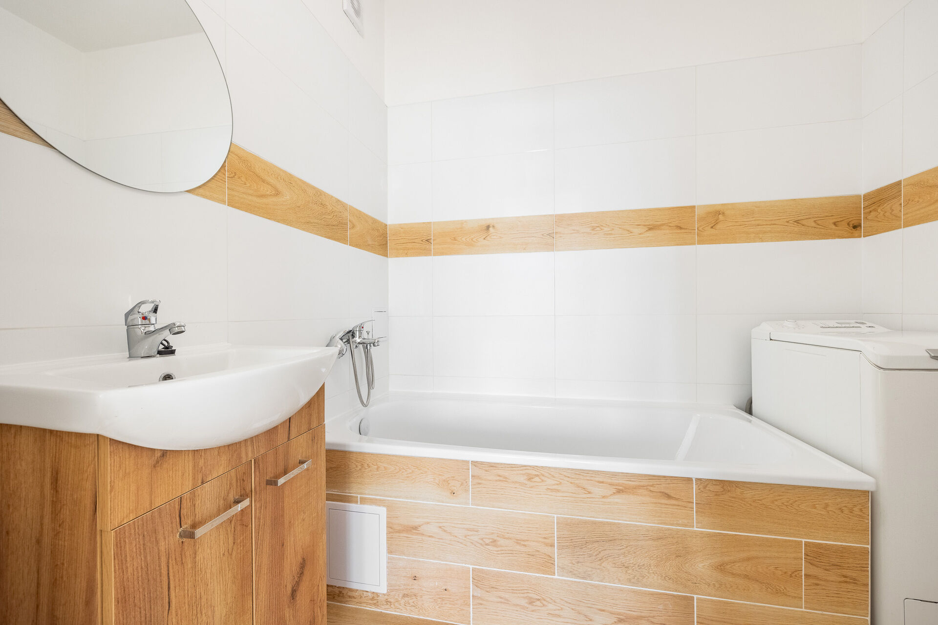 Dále je zde koupelna s vanou a samostatná toaleta. Na podlahách v pokojích, kuchyni je vinylová podlaha v koupelně a toaletě je dlažba. Okna jsou plastová se žaluziemi.