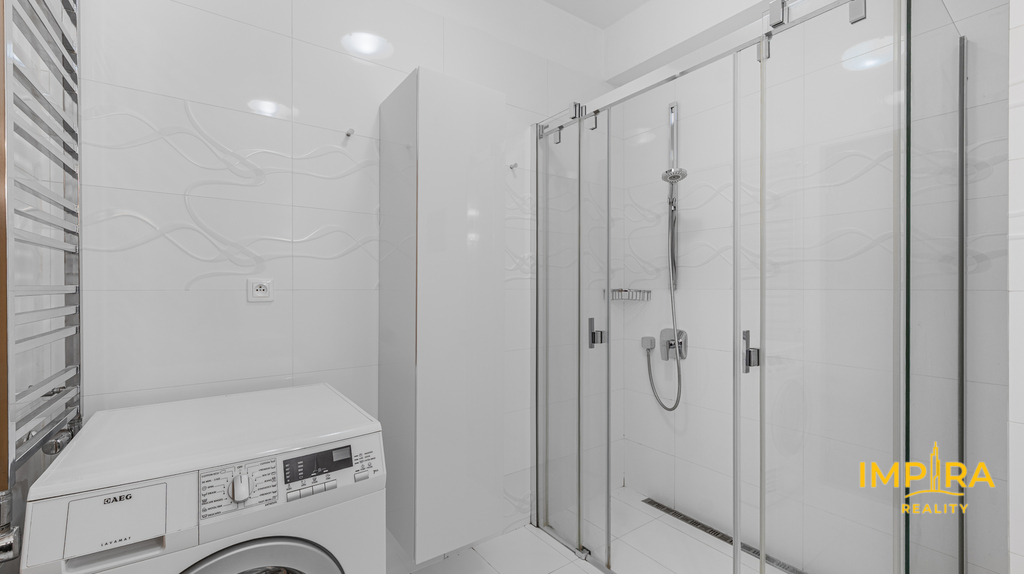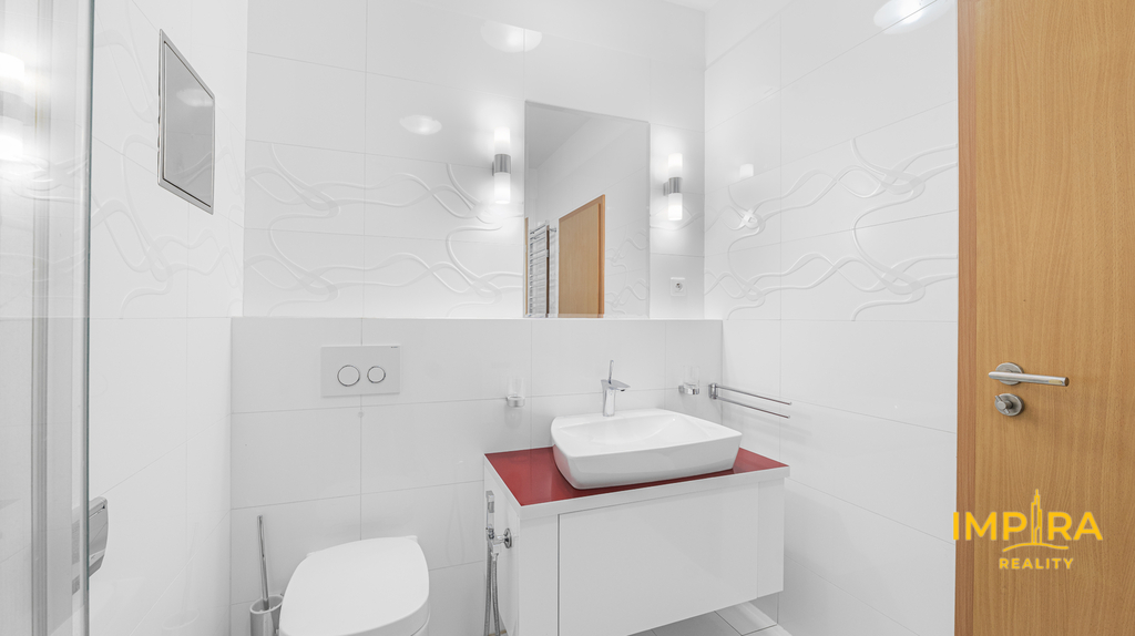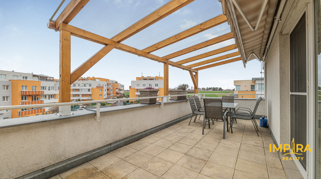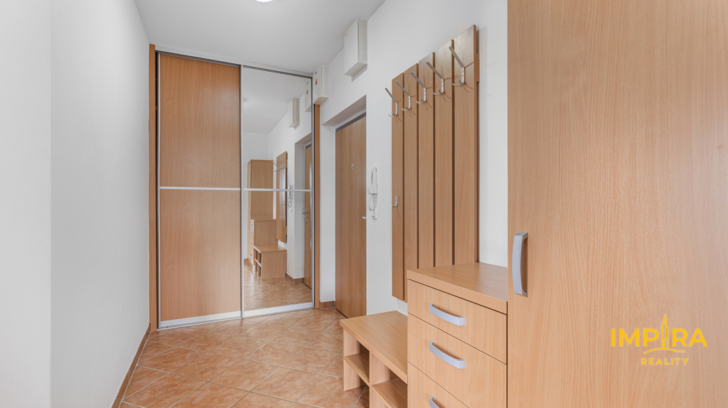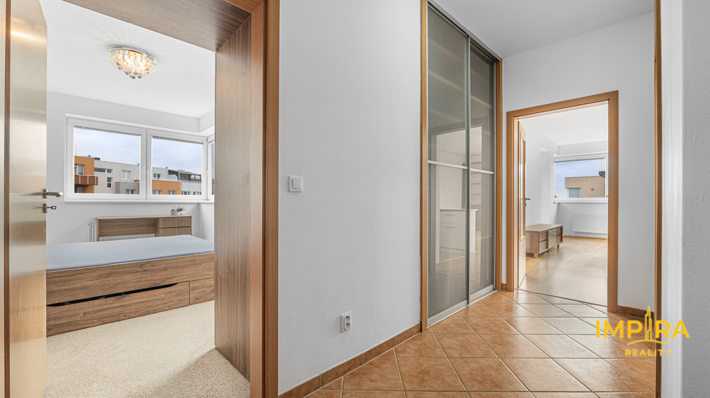 Byt tvoří předsíň s vestavěnými skříněmi, vzdušný obývací pokoj s kuchyňským koutem a samostatná ložnice – obě obytné místnosti jsou vybaveny klimatizační jednotkou, takže v létě i v zimě vždy příjemná teplota. Na prostornou terasu 10 m² s dřevěnou pergolou a polykarbonátovou střechou se dostanete jak z obývacího pokoje, tak z ložnice, ideální místo pro ranní kávu nebo večerní posezení s výhledem do klidného okolí a přilehlé zeleně. Moderní koupelna je vybavena sprchovým koutem, závěsným WC, umyvadlem a pračkou. Myčka nádobí není součástí vybavení. K bytu náleží sklepní koje a vyhrazené parkovací stání přímo u domu se závěrnou rampou.