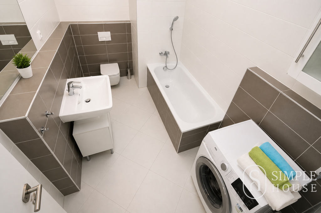 Koupelna je vybavena vanou, umyvadlem, závěsným WC a pračkou AEG. Na oknech jsou žaluzie, v bytě jsou dřevěné podlahy a dlažba. Na balkoně je stolek se dvěma židlemi.