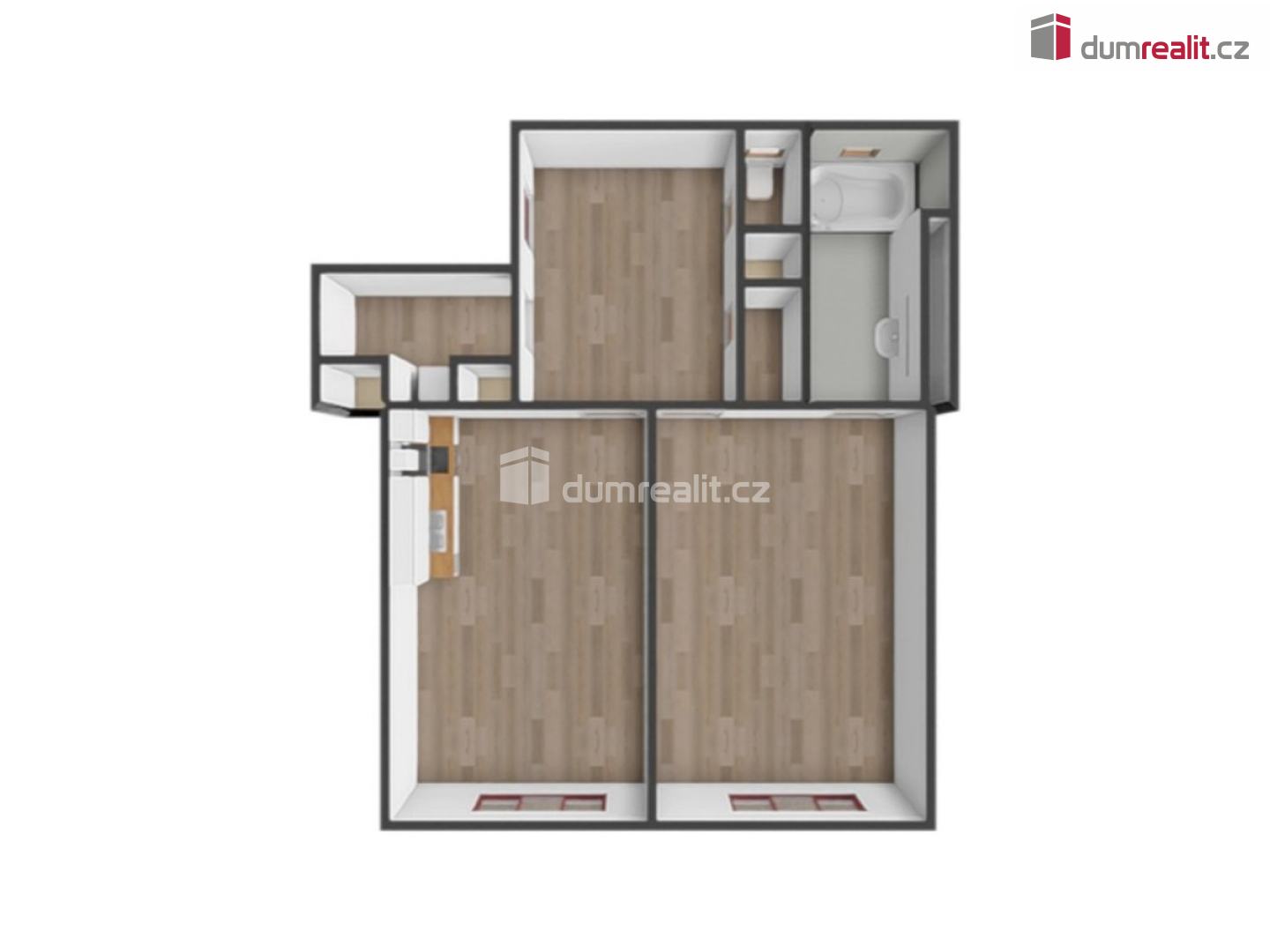 Dispozici bytu tvoří: obývací pokoj (20,3 m²) s novou kuchyňskou linkou, dále ložnice (21,4 m²) se vstupem do koupelny s vanou (3,5 m²), vstupní chodba (7,5 m²) se vstupem do komory (1 m²) a na samostatné WC (1 m²) a do druhé komory (2,5 m²), kde je příprava na pračku a sušičku. Byt je nezařízen nábytkem (na foto pouze ilustračně), je zde kuchyně, sklokeramická deska, vestavěná trouba, digestoř, osvětlení, zrcadlo a skříňka v koupelně.