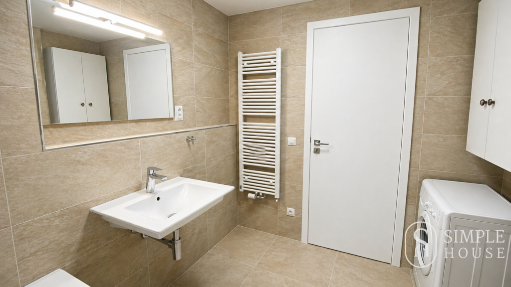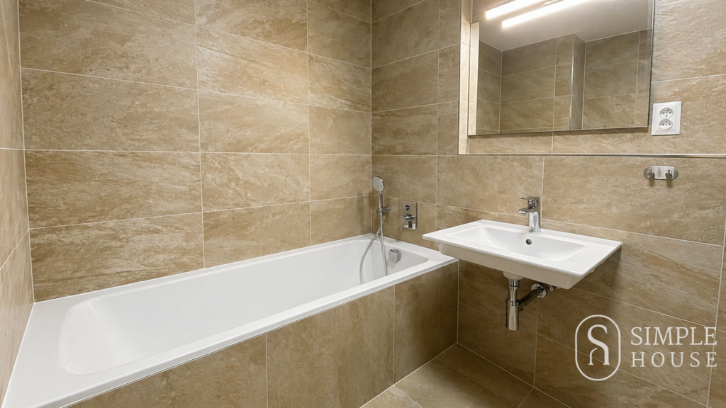 Koupelna je vybavena vanou, pračkou a velkoformátovým zrcadlem s osvětlením. V bytě je k dispozici vysokorychlostní optický internet.