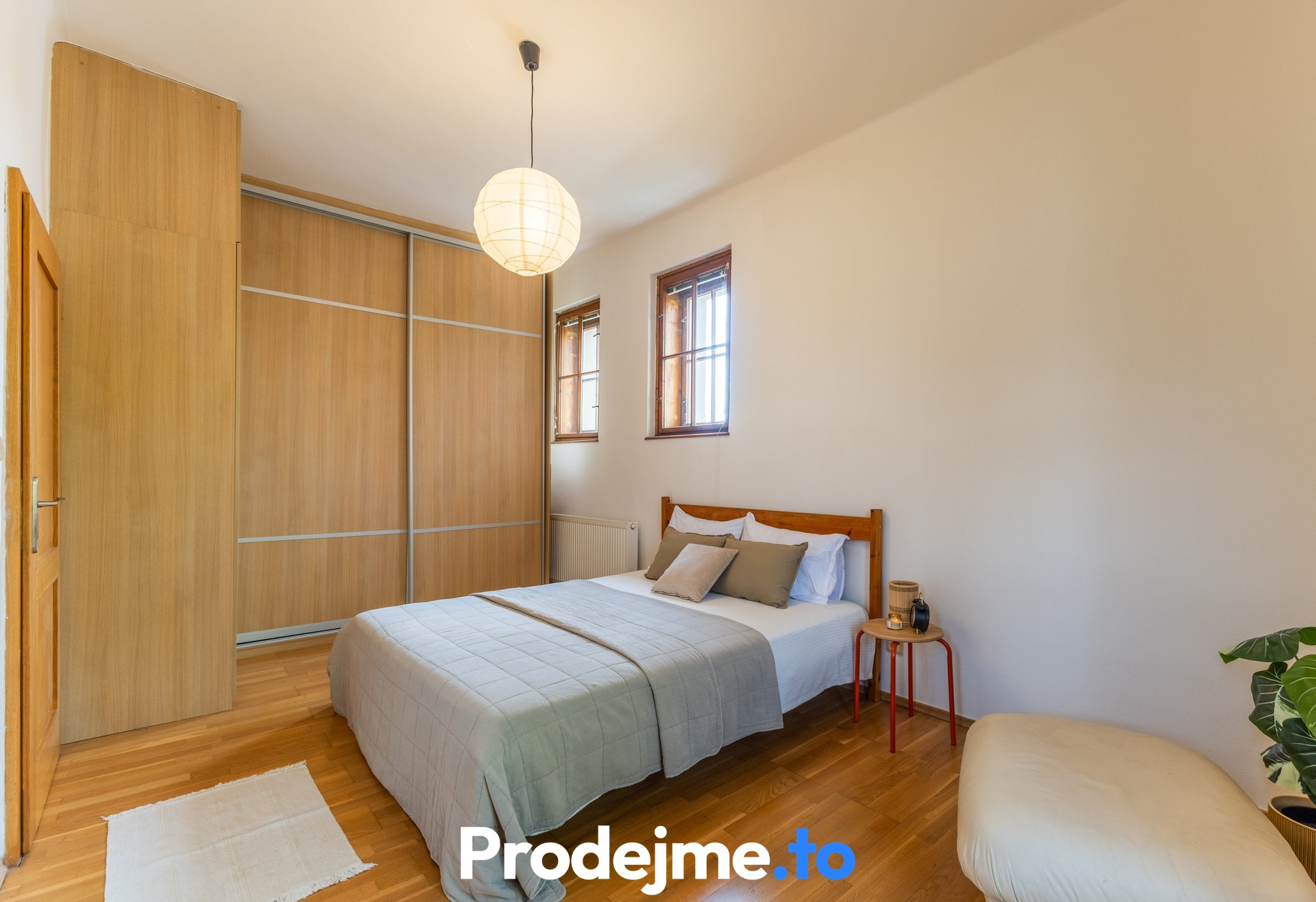 Ložnice směřuje na klidnější severní a západní stranu a nabízí velkorysé vestavěné skříně. Její největší benefit ale objevíte až po odsunutí dřevěných dveří – skrývá se za nimi samostatný prosvětlený výklenek pro práci. Ideální řešení pro home office, které nijak nenarušuje odpočinkovou zónu. Koupelna potěší milovníky moderního stylu: dlažbu s velkoformátovými šedými obklady doplňují černé baterie, široké umyvadlo a prostorný sprchový kout typu walk-in. Toaleta je samostatná.