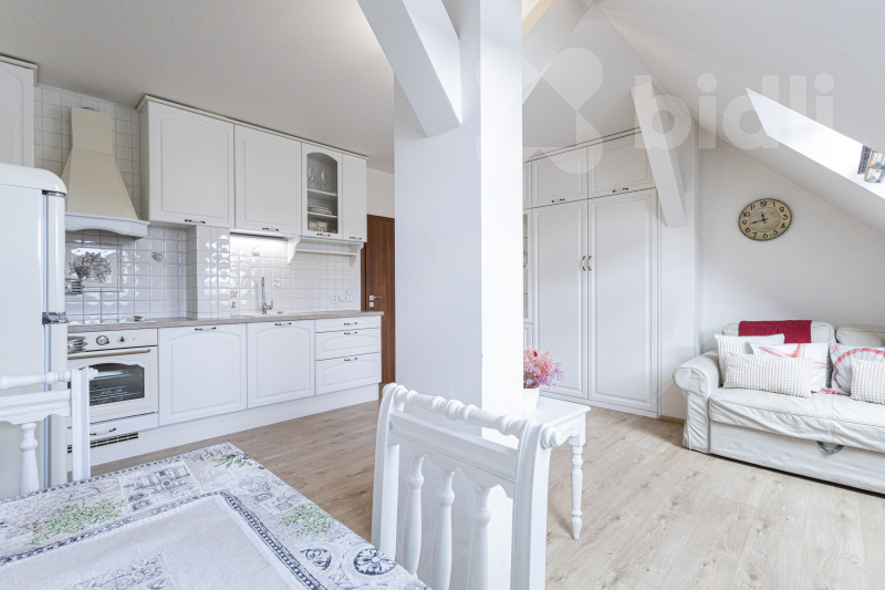 Dispozice 2+kk, prostorná chodba s dostatkem úložných prostor, koupelna s vanou s praktickou zástěnou a novou pračkou se sušičkou, samostatná toaleta, obývací pokoj s kuchyňským koutem (nová lednice s mrazákem, trouba, varná deska, digestoř, mikrovlnná trouba, základní kuchyňské vybavení nože, příbory, hrnce, hrnečky, skleničky), ložnice s postelí a skříněmi, psací stolek. K bytu náleží sklep (4m2).