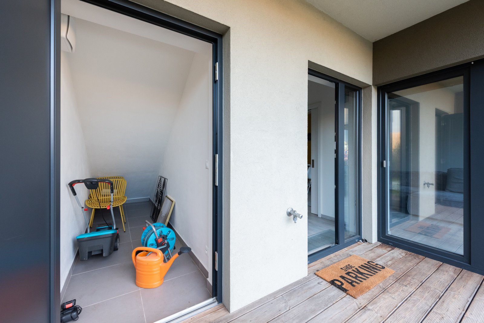 Největší předností bytu je však krásná předzahrádka s dostatkem soukromí o velikosti téměř 70 m². Venkovní prostor je maximálně praktický – je zde přivedená voda pro zalévání, elektřina vhodná například pro grilování a velkou výhodou je i vlastní úložný prostor pro zahradní nábytek, sekačku nebo věci, které nechcete nosit přes byt ani ukládat ve sklepě. Ten je Vám k dispozici o výměře 6 m2 a další úložné prostory zajišťuje vestavěná skříň s botníkem na chodbě.