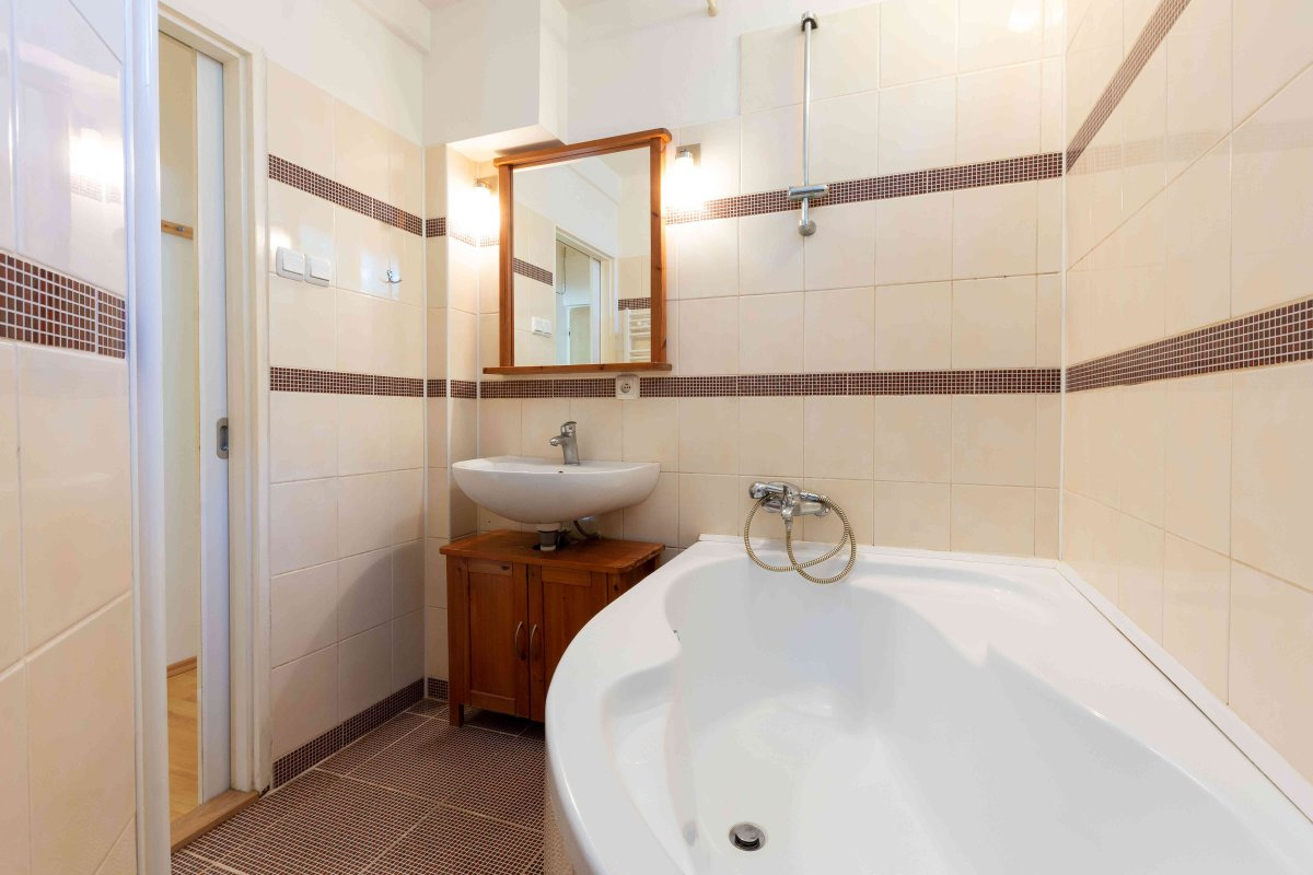 Byt se nabízí nevybavený. Kuchyně disponuje lednicí, a troubou. V koupelně je vana, pračka a umyvadlo. Toaleta je umístěna samostatně.
