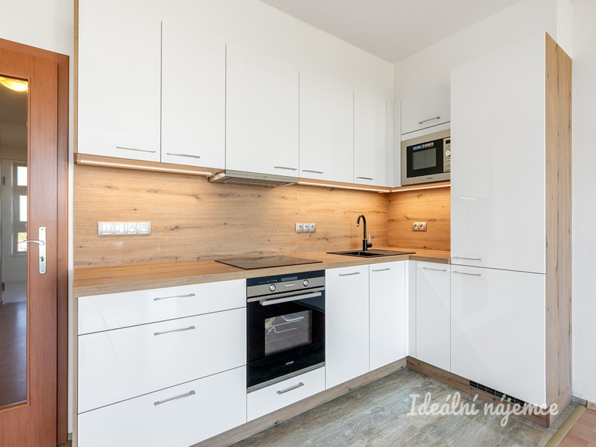 Zcela nová kuchyňská linka, zhotovená na míru je vybavena všemi vestavnými spotřebiči - lednice s mrazákem, myčka, vestavná mikrovlnná trouba, sklokeramická varná deska, odtahová digestoř a trouba.