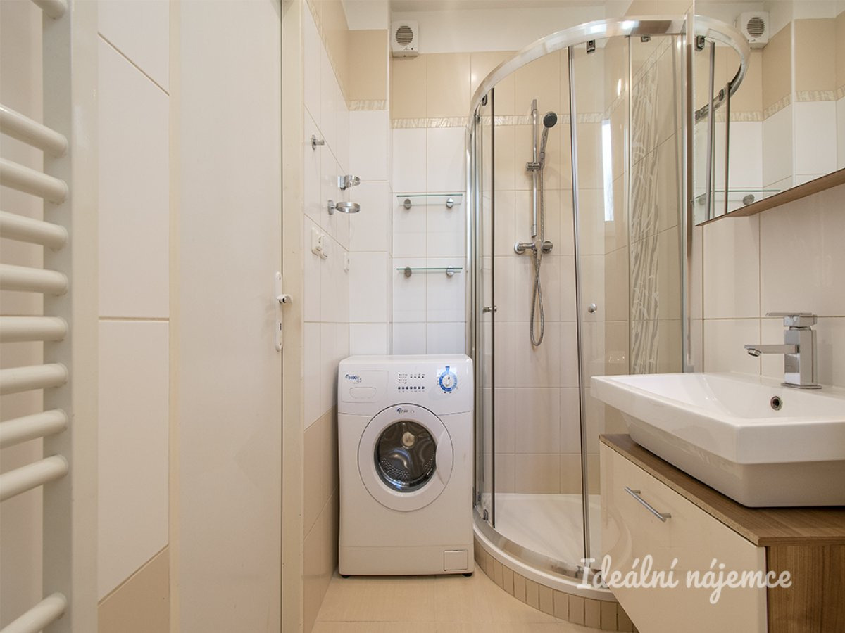 Byt se nabízí vybavený. V kuchyni se nachází praktická kuchyňská linka s plynovým sporákem, troubou, digestoří, lednicí a mikrovlnnou troubou. Kuchyň je spojena s obývacím pokojem, ve kterém nalezneme televizi a televizní stolek, černou sedací soupravu, stůl s židlemi a skříň s policemi, stůl se čtyřmi židlemi, na podlaze jsou položeny parkety. V ložnici je vestavěná skříň se zrcadli sloužící jako úložný prostor, i. Koupelna je spojena s WC, dále je k dispozici pračka, sprchový kout a umyvadlo se skříňkou.
