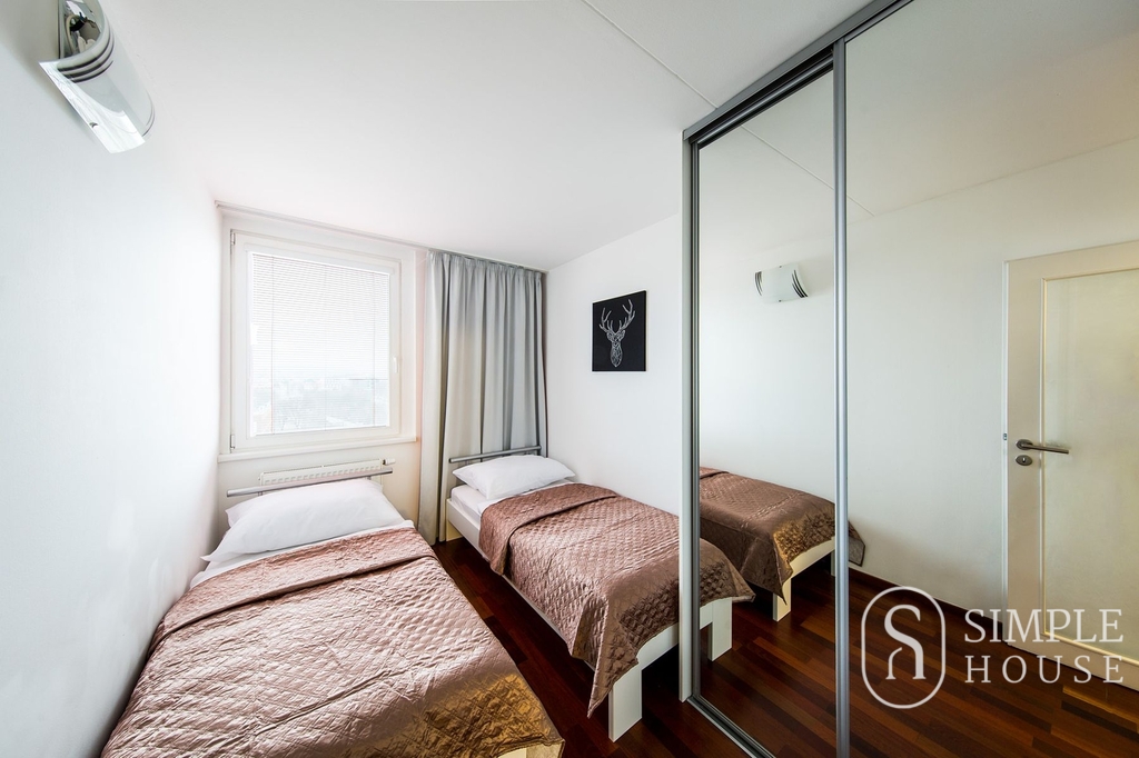 Byt se nachází v 10. patře moderní rezidence Expo a nabízí krásný panoramatický výhled na Prahu včetně Pražského hradu. Dispozice zahrnuje dva samostatné pokoje a obytnou, plně zařízenou kuchyň, což poskytuje komfortní bydlení ideální například pro dvě osoby, z nichž každá může mít vlastní pokoj.