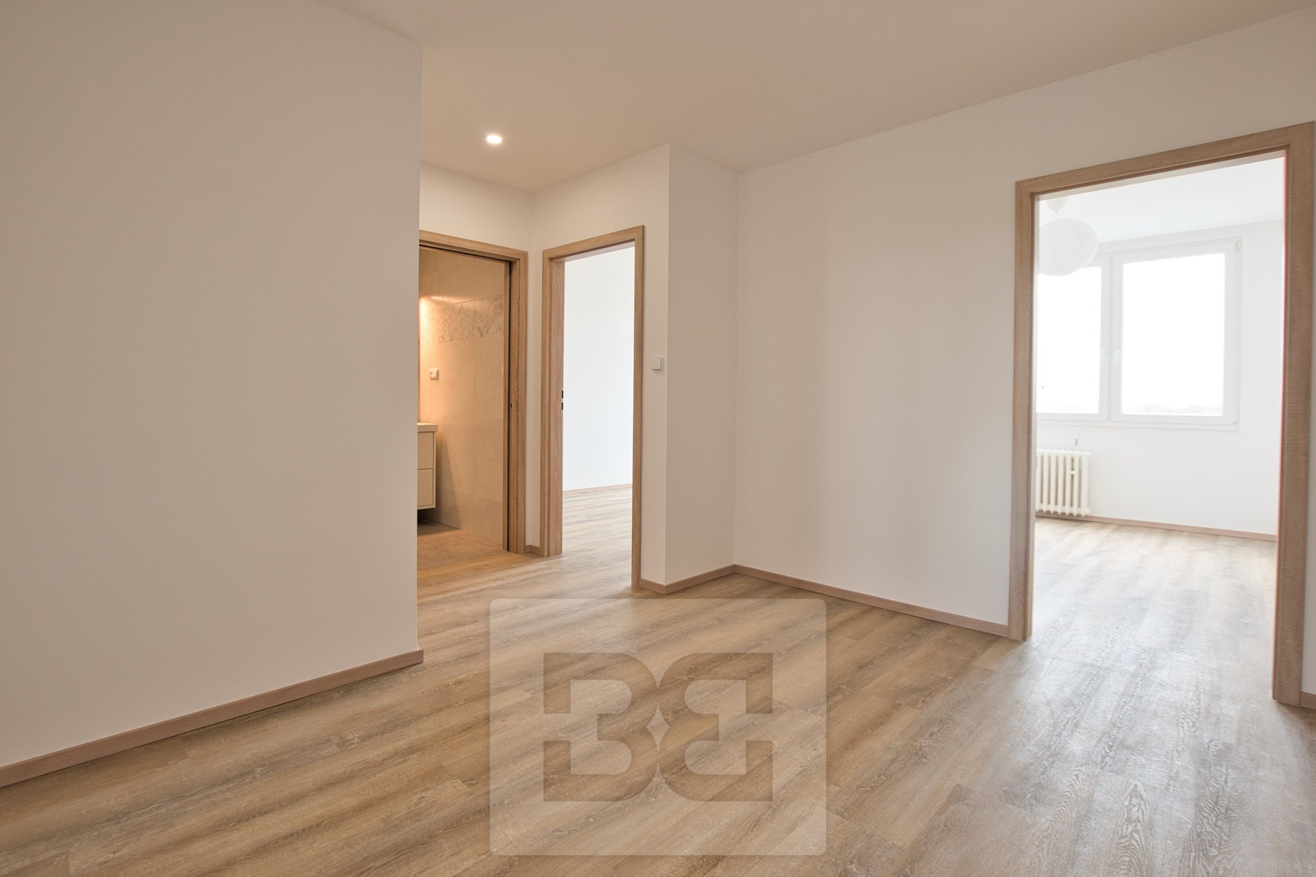 Byt disponuje prostorným obývacím pokojem s moderním kuchyňským koutem a vstupem na balkon. Kuchyňská linka zahrnuje lednici, myčku nádobí, horkovzdušnou troubu, mikrovlnou troubu, indukční desku, digestoř a spoustu pracovního a úložného prostoru. Byt nabízí 2 samostatné ložnice. Koupelna je vybavena vanou a pračkou. Toaleta je oddělená. Na patře naproti bytu se nachází úložný prostor. Dále je možné využít kočárkárnu v přízemí domu.